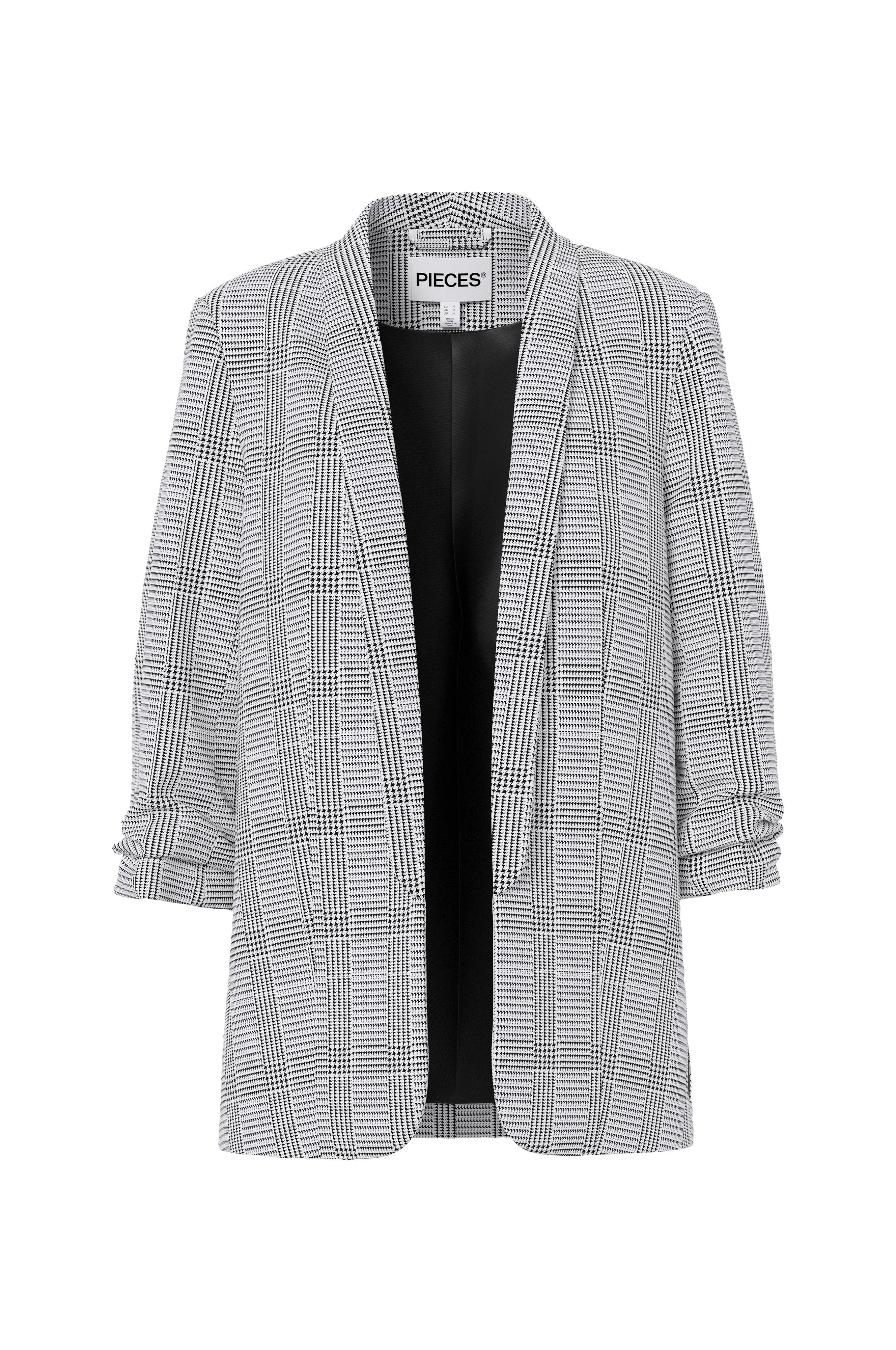 • Mønstret habitjakke med sjalskrave• Åben model• 3/4 lange ærmer med rynket nedre del• Tynde skulderpuder• Tyndt, vævet for• Længde: cm i størrelse