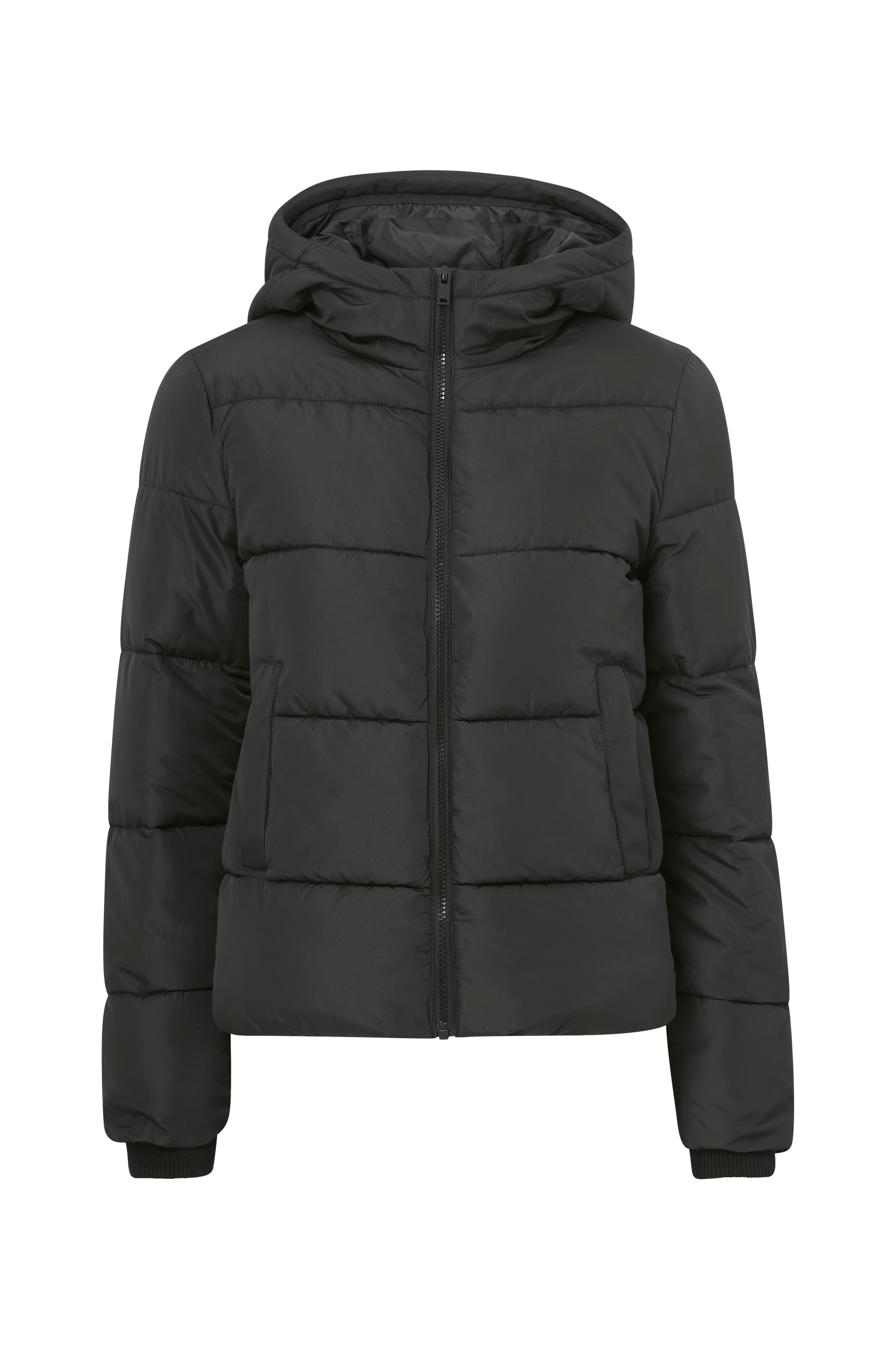 Quiltet og vatteret dynejakke med fast hætte. Lynlås og to lommer. Ribkanter i ærmekant og elastik i kanten forneden.