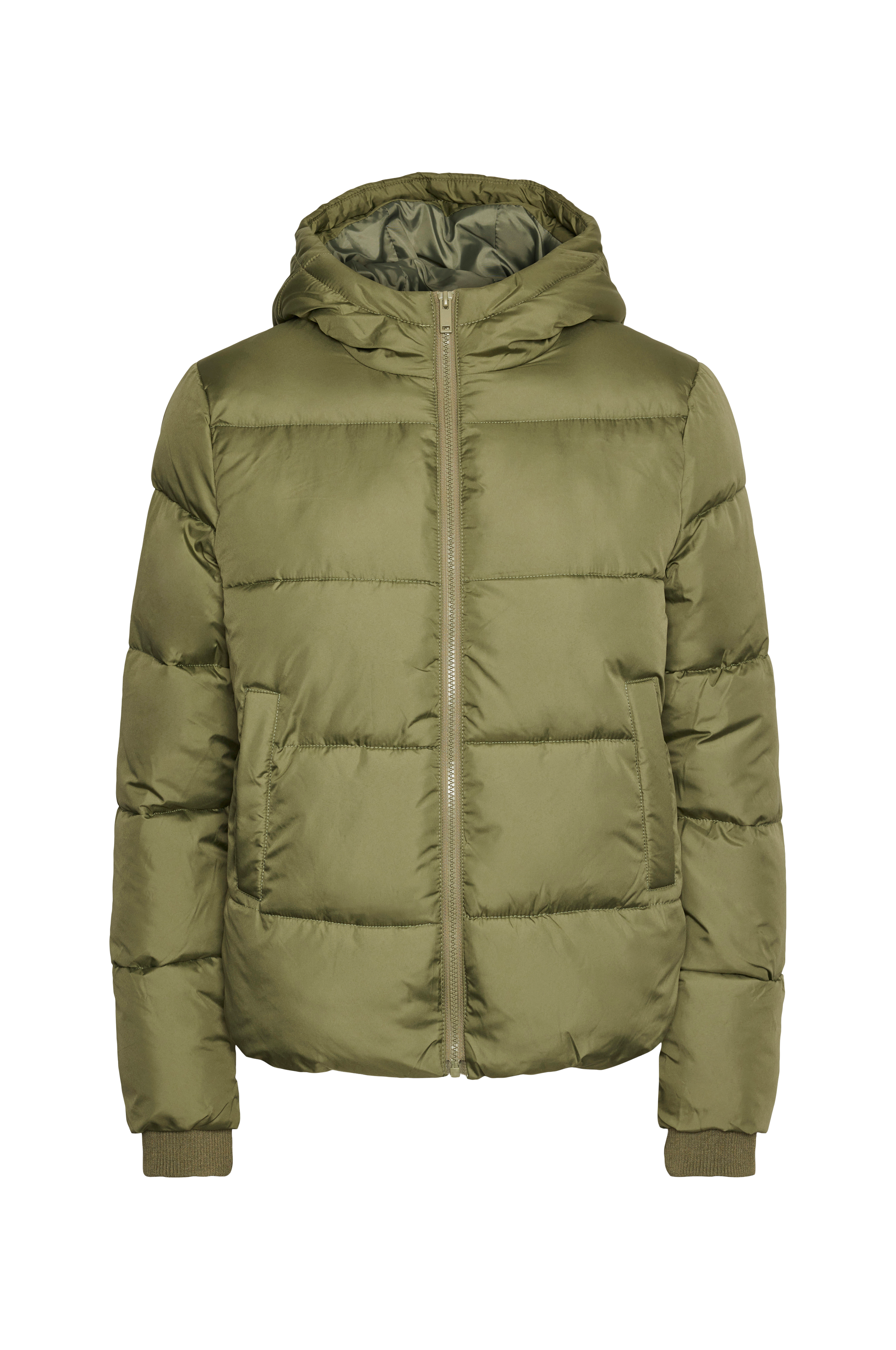 Quiltet og vatteret dynejakke med fast hætte. Lynlås og to lommer. Ribkanter i ærmekant og elastik i kanten forneden.