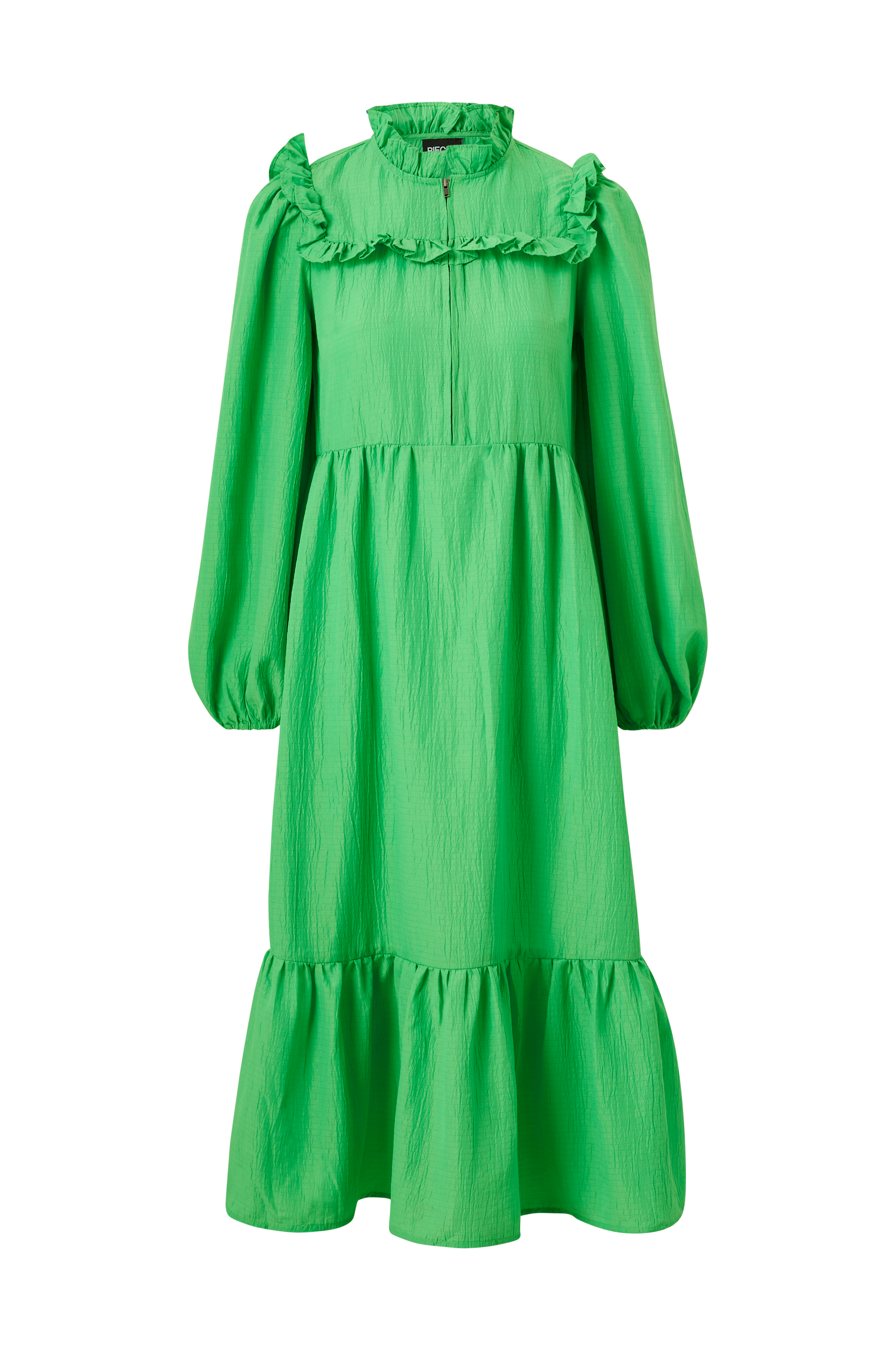 • Midikjole med volant nederst • Skjult lynlås foran • Ballonærmer med elastiske manchetter • Volant på skuldrene og i halsen • Længde: 117 cm i størrelse S • Produktet indeholder genindvundet materiale, som genbruges for at reducere mængden af affald samtidigt med at der ikke anvendes nye ressourcer.