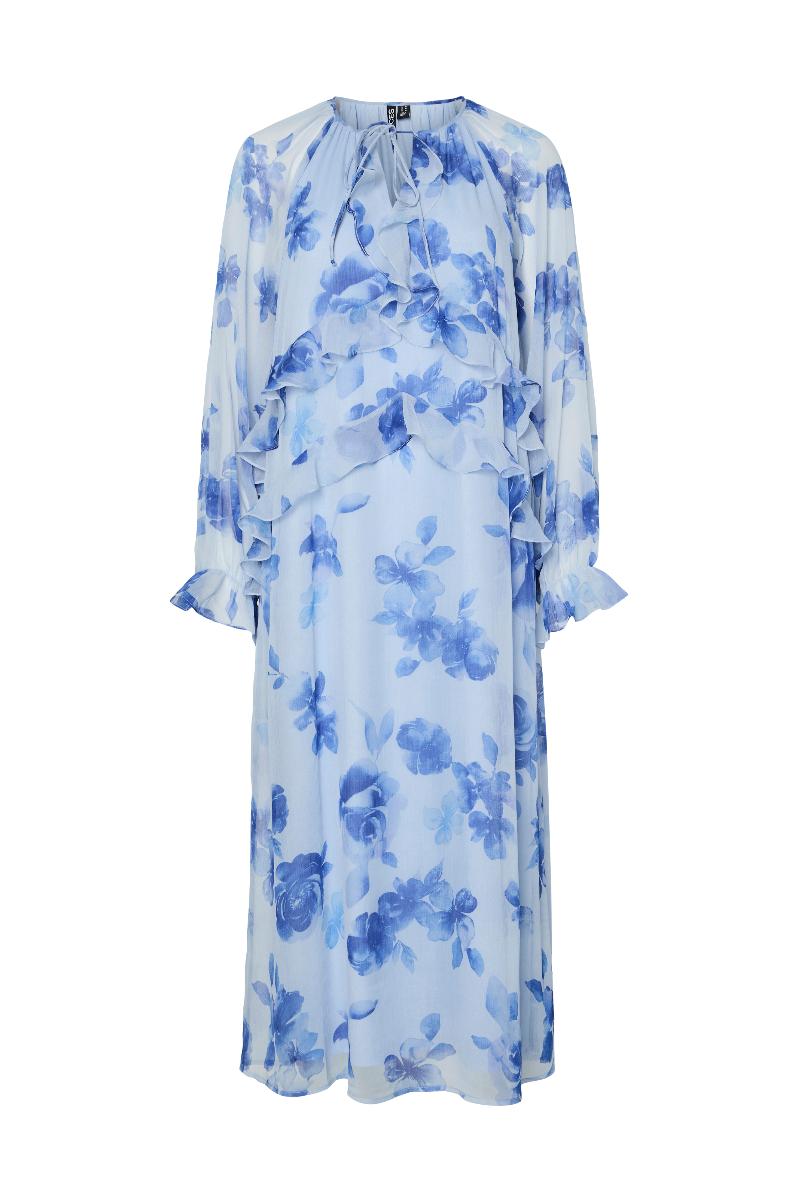 • Lang, foret chiffon kjole med volanter• Rund halsudskæring med slids og knudedetalje• Lange, uforede ærmer med elastik ved manchetterne• Længde: 128 cm i størrelse S