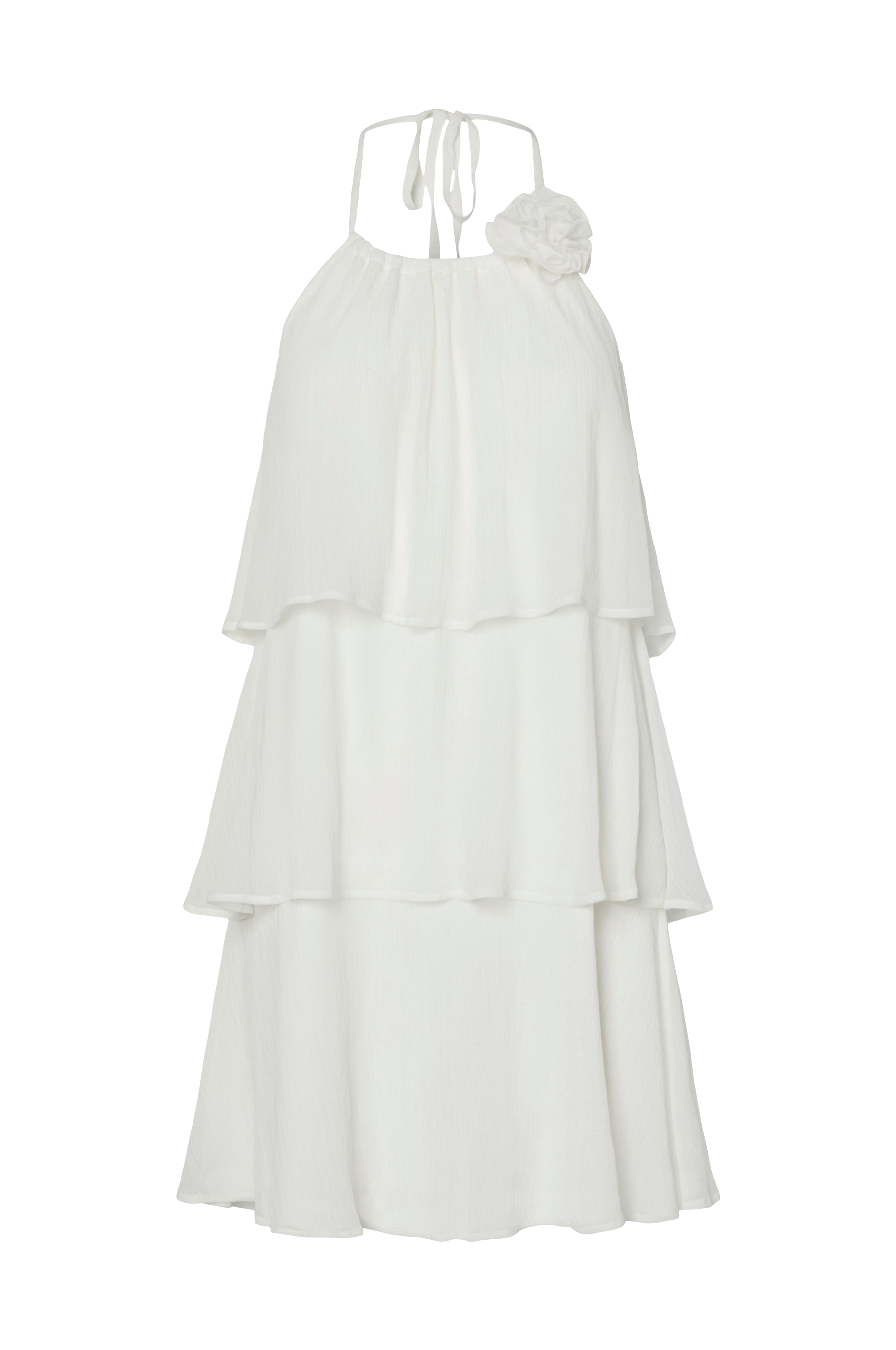 • Ærmeløs model i chiffon crepe med svaj med volanter• Bindebånd i nakken• Blomst i tekstil på toppen• Foret• Længde: 92 cm i størrelse S