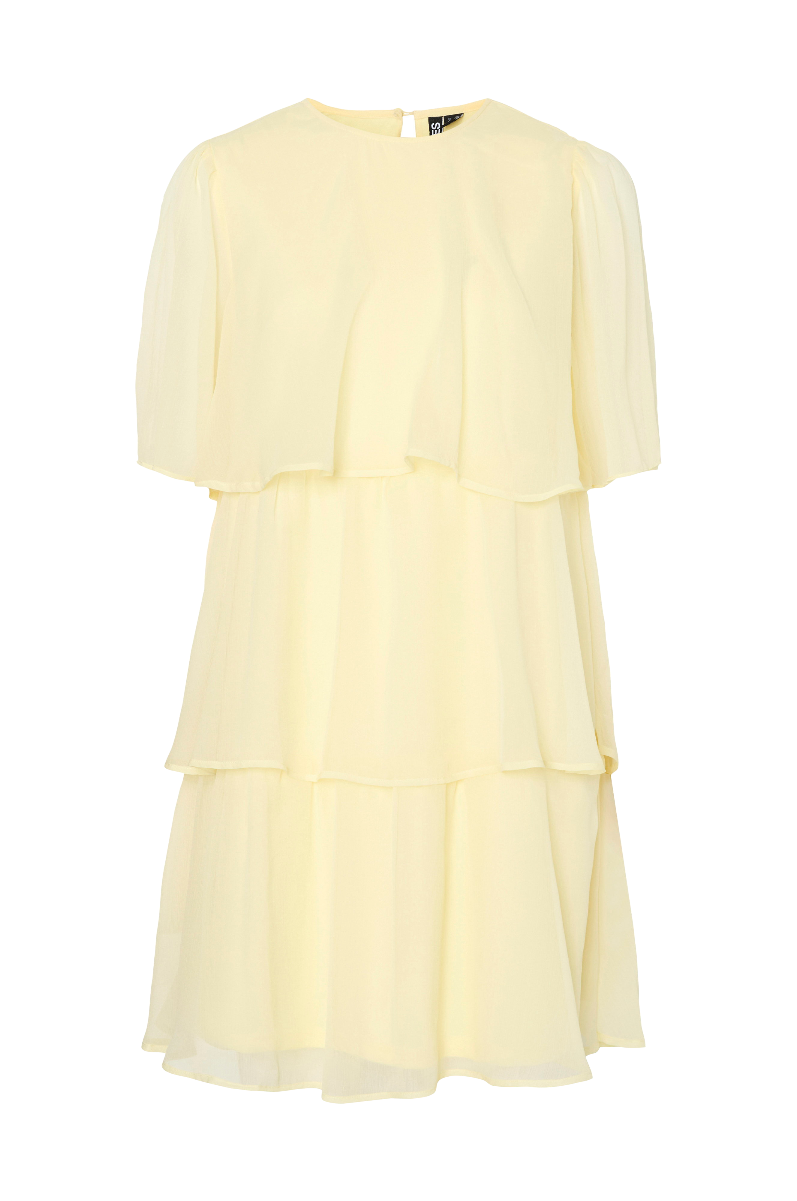 • Kjole med volanter i chiffon• Rund halsudskæring• Korte, uforede pufærmer• Elastisk underkjole i jersey• Nøglehulsåbning med knap i nakken• Længde: 88 cm i størrelse S