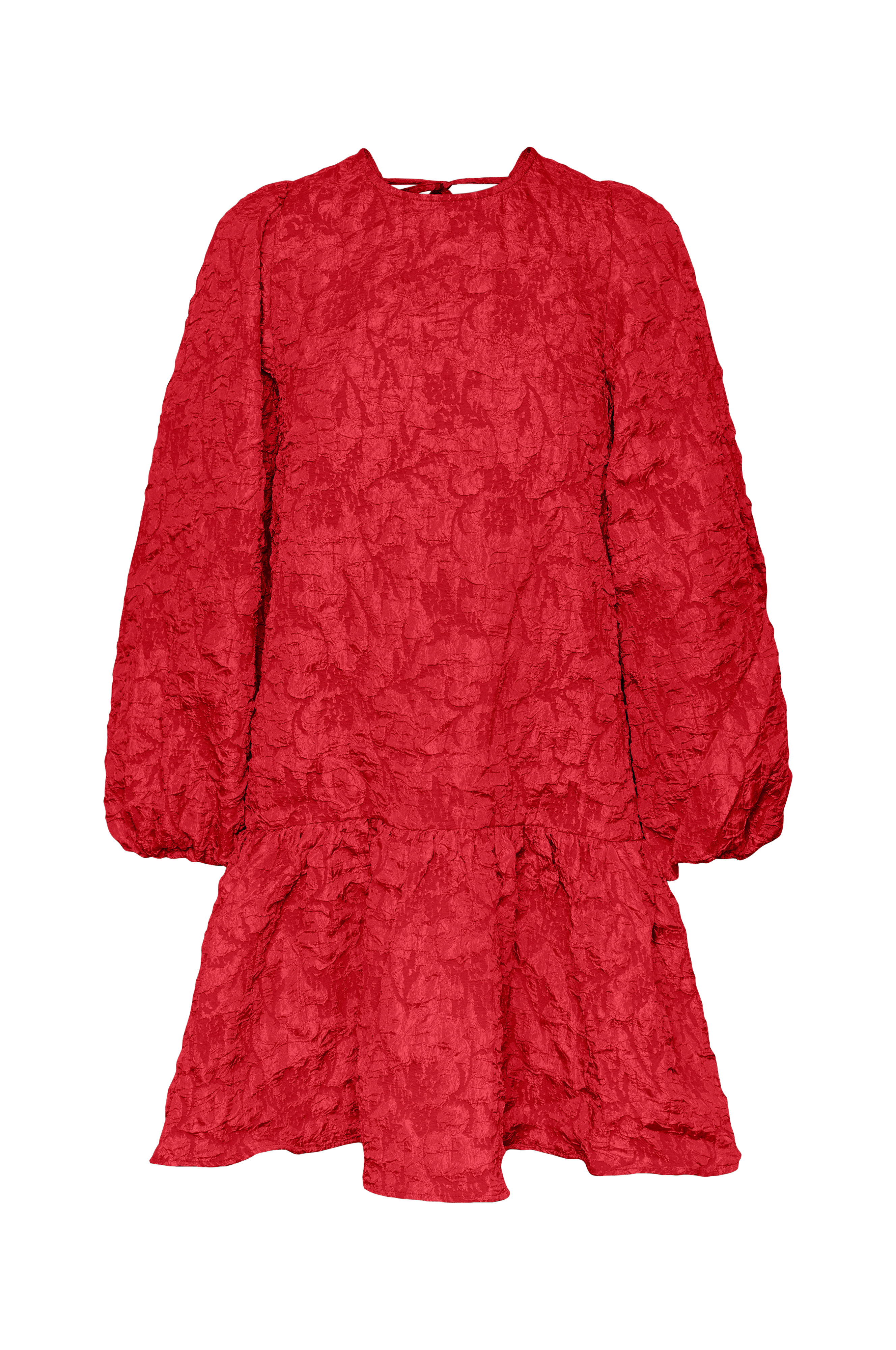 • Kort model med svaj i strukturel kvalitet• Rund hals• Dybt skåret ryg med tre bindebånd• Ekstra bredt ærme med elastik ved manchetterne• Bred volant ved nederste kant• Længde: 90 cm i størrelse S