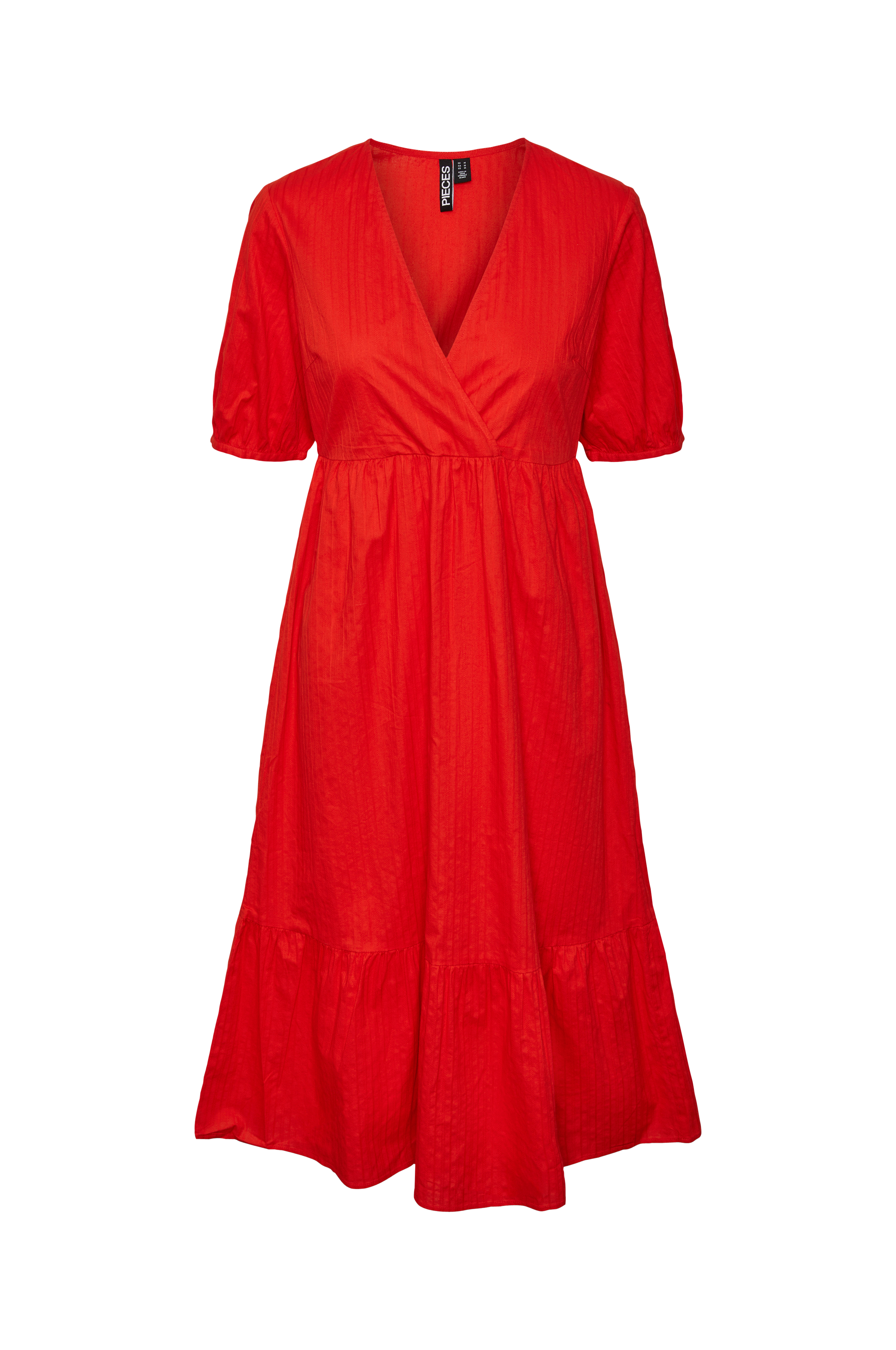 • Model med svaj med bred volant ved nederste kant• Slå-om design på toppen• Kort ærme med elastik ved manchetterne• Defineret talje med elastik bagpå• Længde: 116 cm i størrelse S