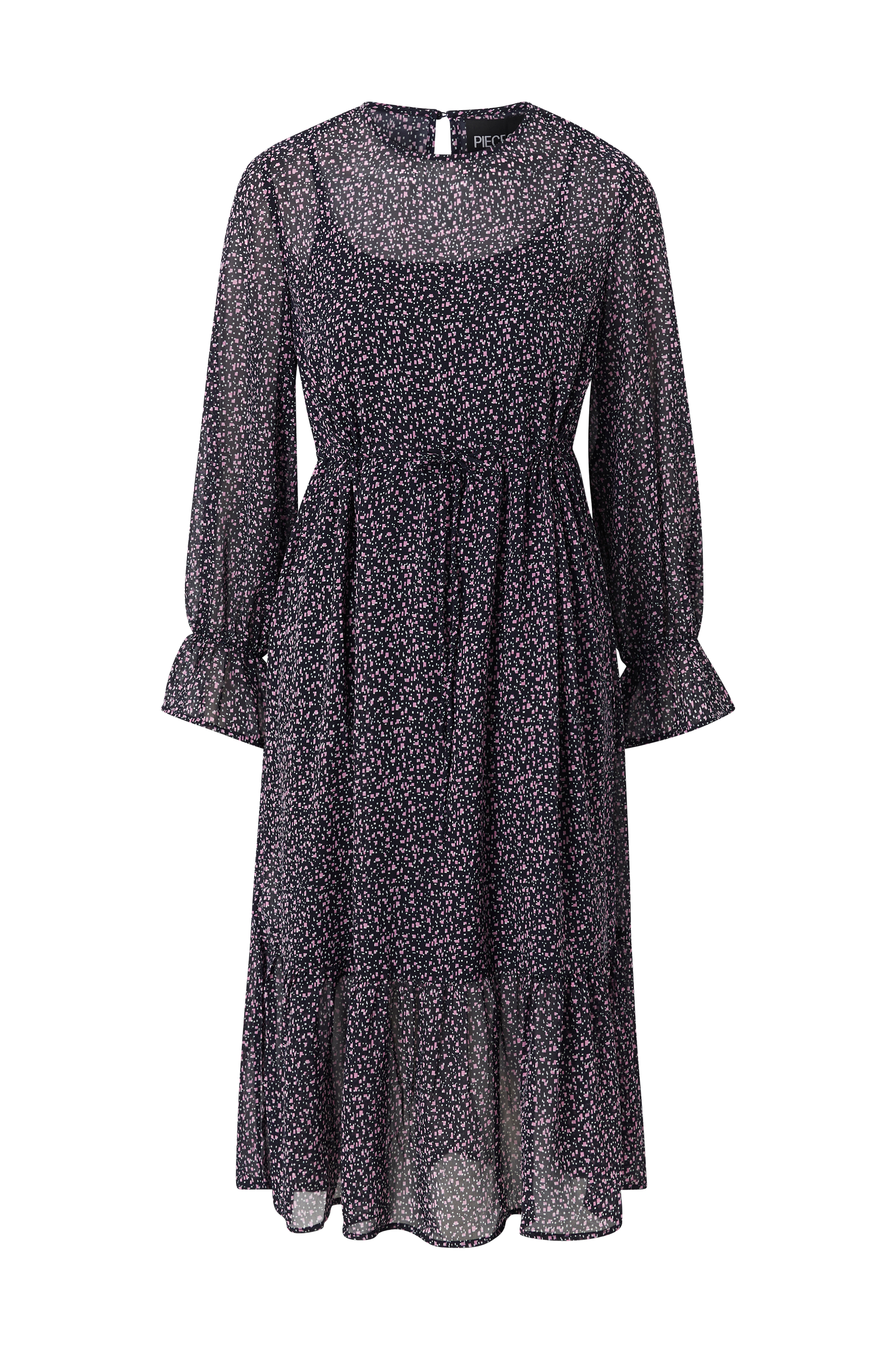 Kjole pcMisty LS Midi Dress fra Pieces i læglang model med løbegang i taljen, flæse forneden og lange, vide ærmer med elastik og flæse i ærmekant. Rund hals med slids og knap i nakken. Aftagelig underkjole i jersey. Længde ca. 112 cm i str. S.