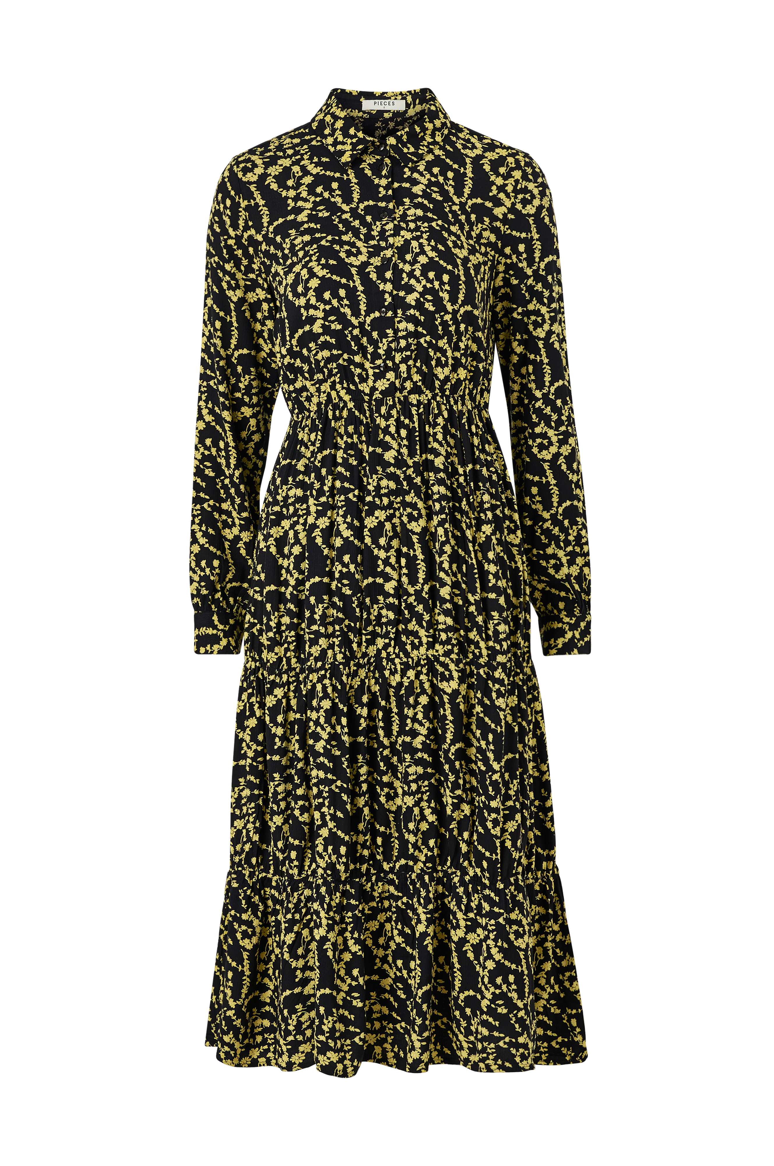 Kjole pcNadin LS Midi Dress fra Pieces. Figursyet model med afskæring og indvendig elastik i taljen samt brede flæser i nederdel. Lille skjortekrave og kort stolpelukning samt langt ærme med manchet i ærmekant. Længde ca. 121 cm i str. S.