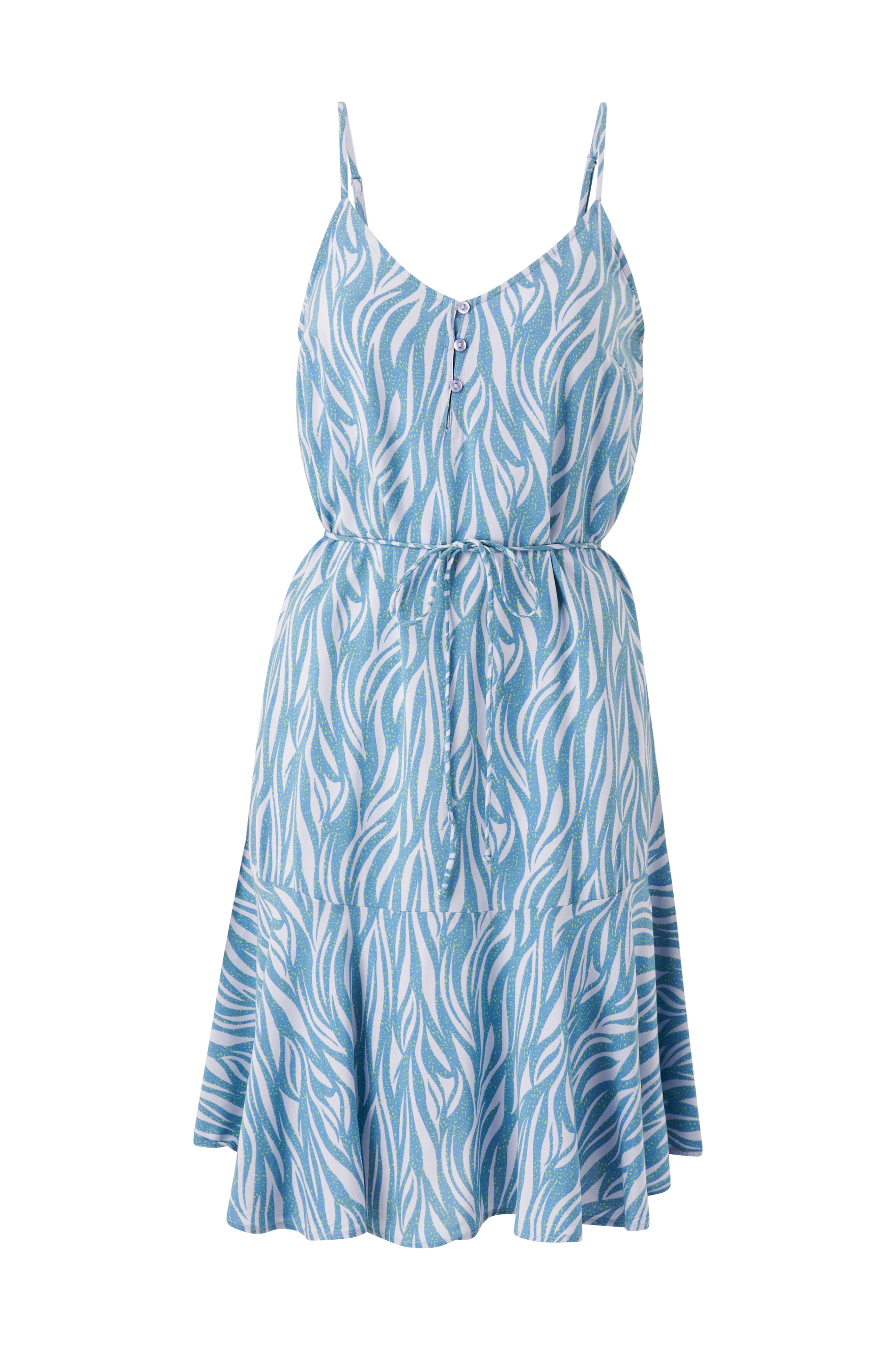 Kjole i vævet, mønstret viskose. Knapper foran, flæse forneden, smalt bindebælte i taljen og smalle, justerbare skulderstropper. Længde ca. 95 cm i str. S.