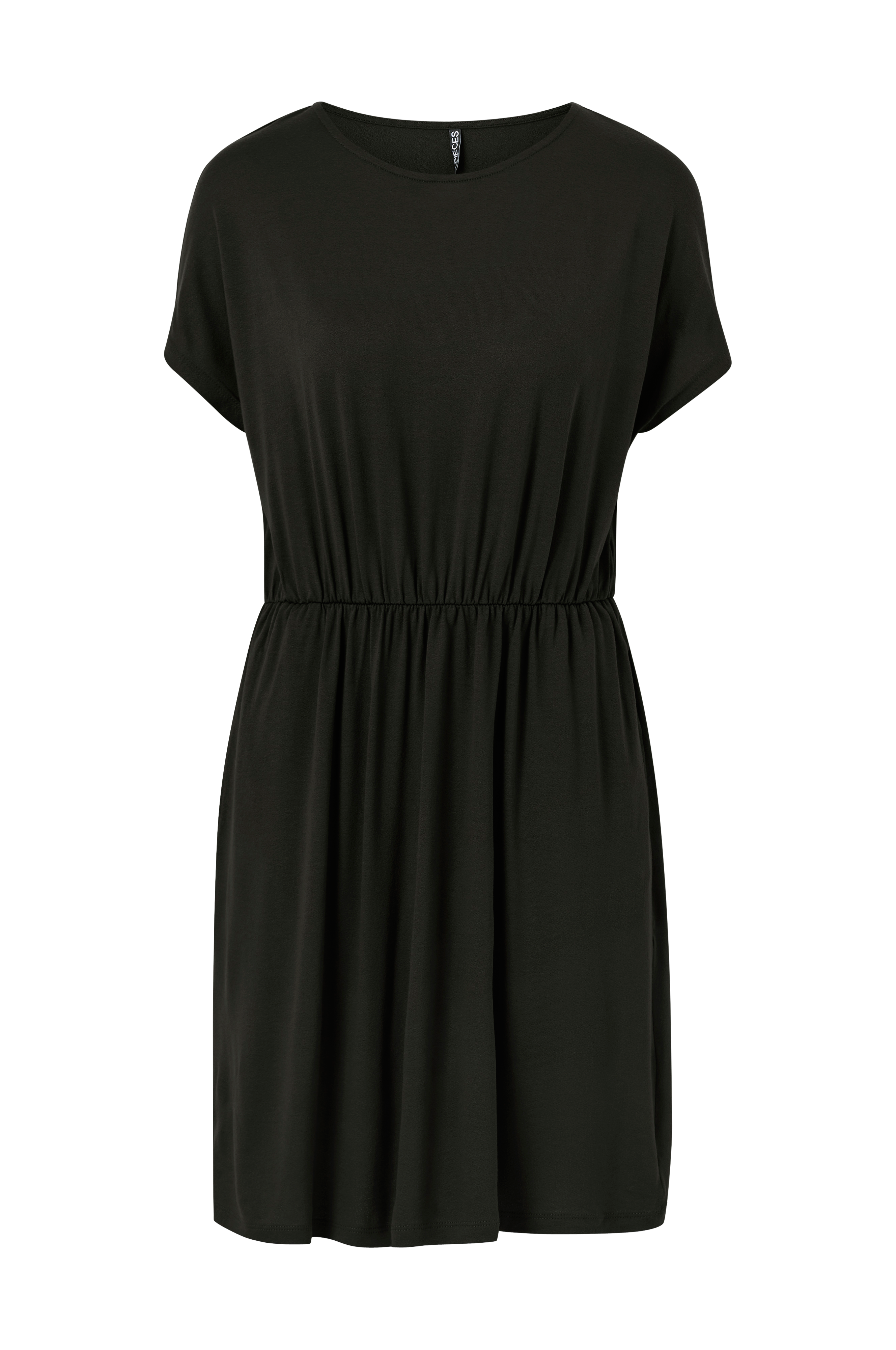 Kjole i blød viskosejersey. Korte ærmer, elastisk talje og lommer i siderne. Længde ca. 95 cm i str. S.