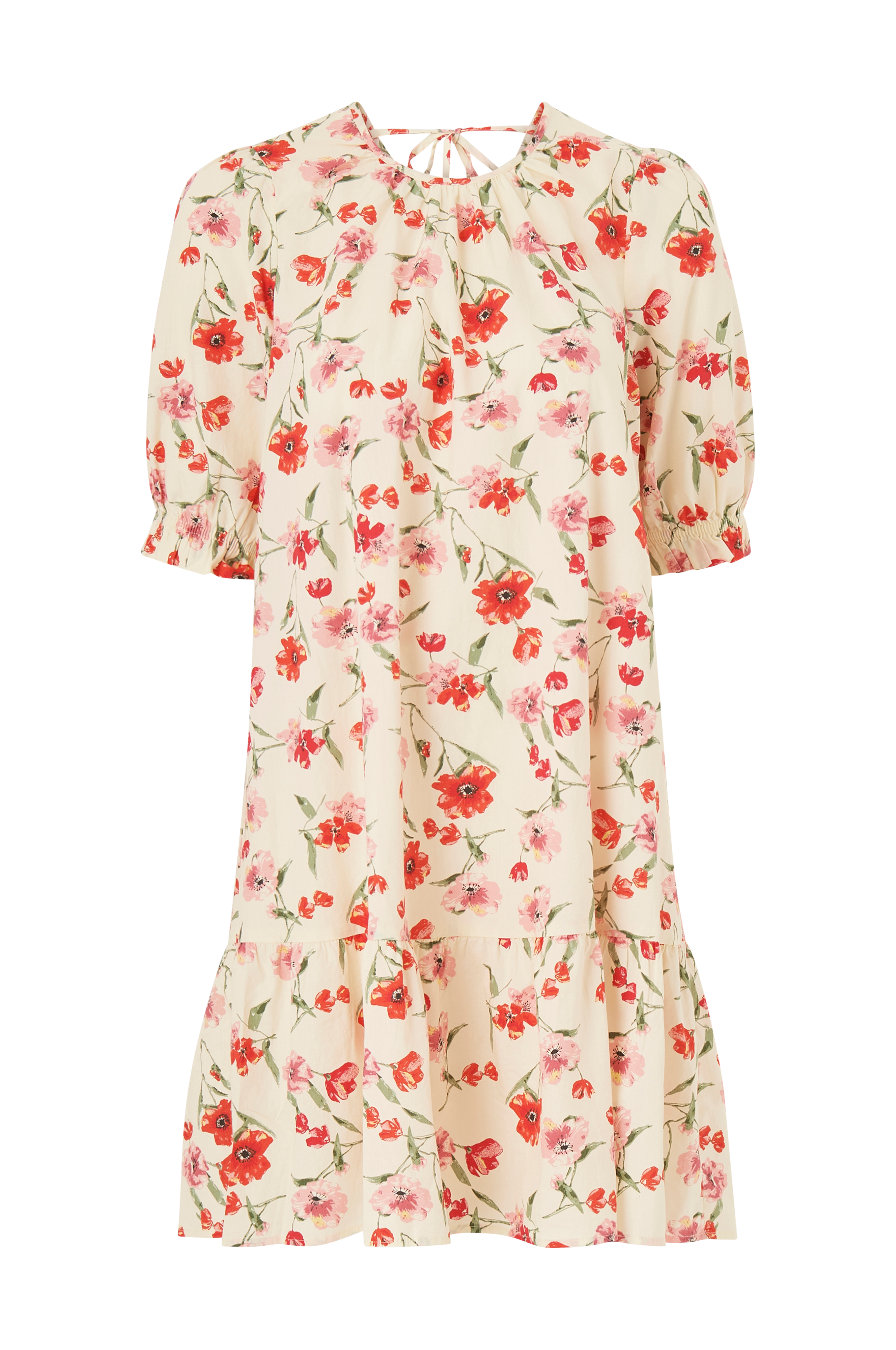 • Kort kjole med A-linje design• Rund hals med samling• V-udskæring med bindebånd i ryggen• Halvlange ærmer med elastiske manchetter• Volant nederst• Længde: 87 cm i størrelse S