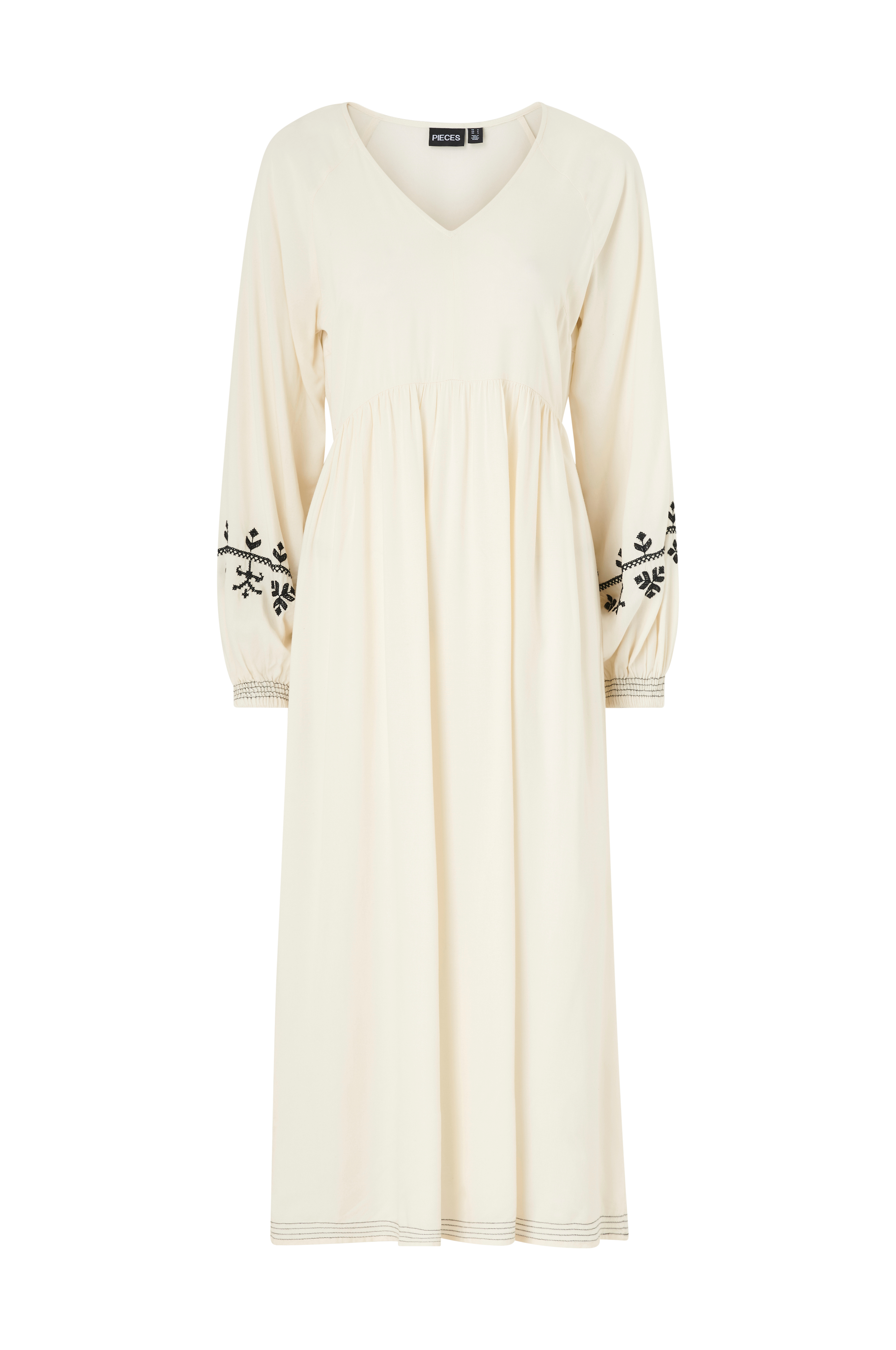 • Figurformede model med rynket talje foran og elastik bagpå• V-formet halsudskæring• Ekstra langt raglanærme med broderier og elastik ved manchetterne• Længde: 129 cm i størrelse S
