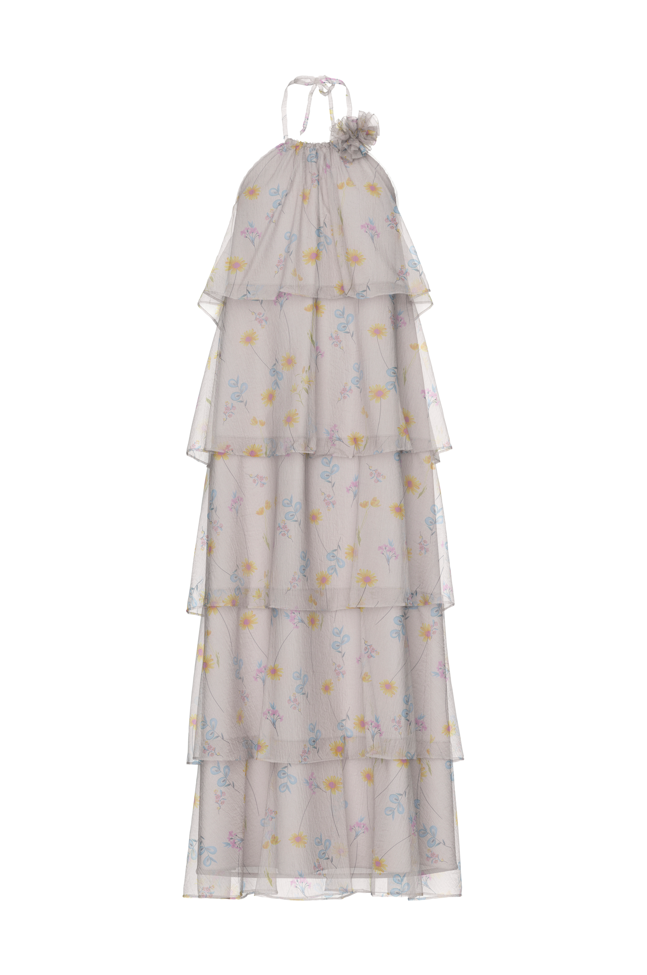 • Ærmeløs model med svaj i chiffon crepe med volanter• Indlagt elastik oppe bagved• Bindebånd i nakken• En blomstret applikation på toppen• Foret• Længde: 132 cm i størrelse S