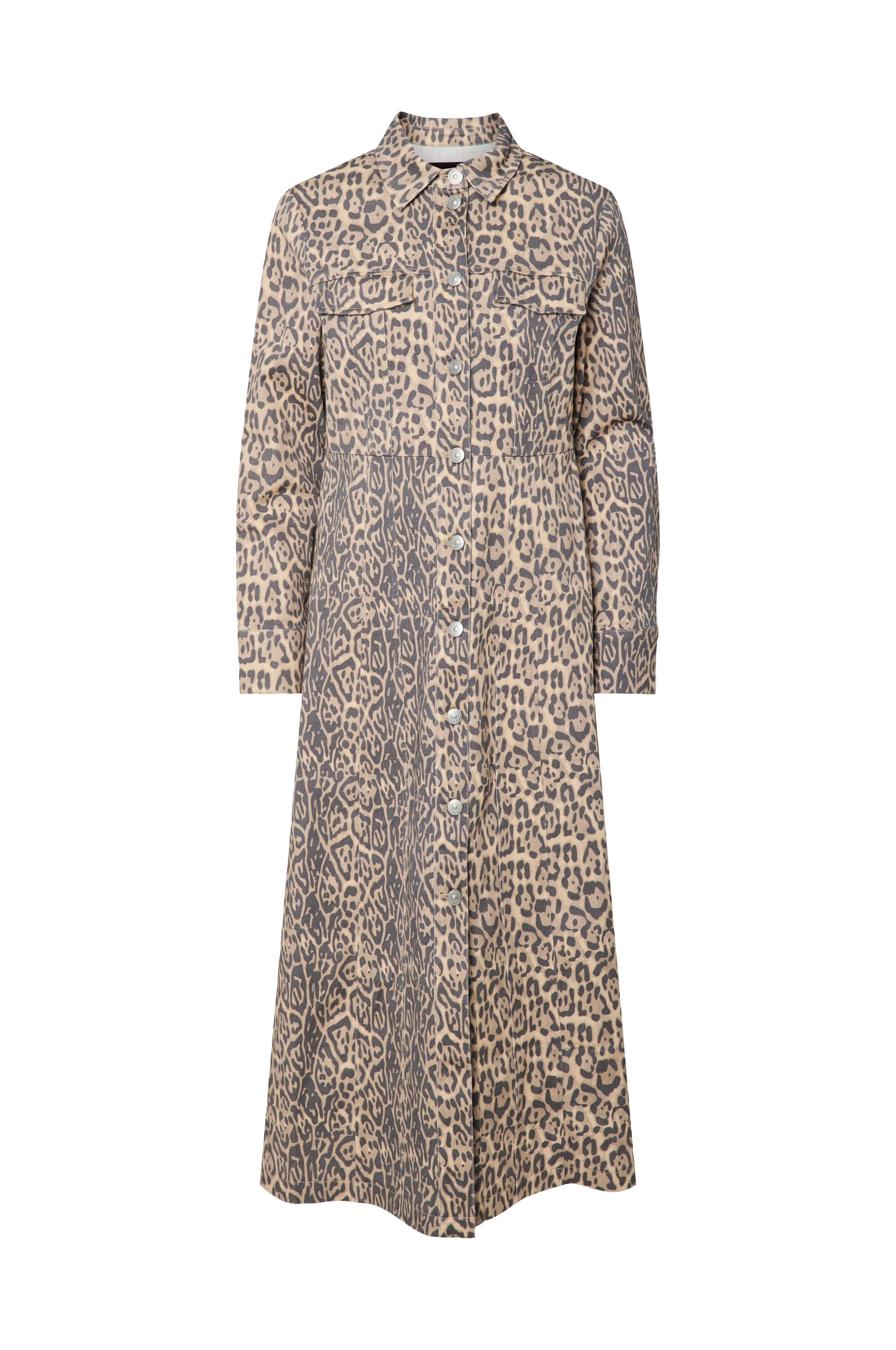 • Skjortekjole med metalknapper hele vejen frem• Brystlommer med låg• Langt ærme• Vertikale sømme• Markeret talje• Længde: 130 cm i størrelse S