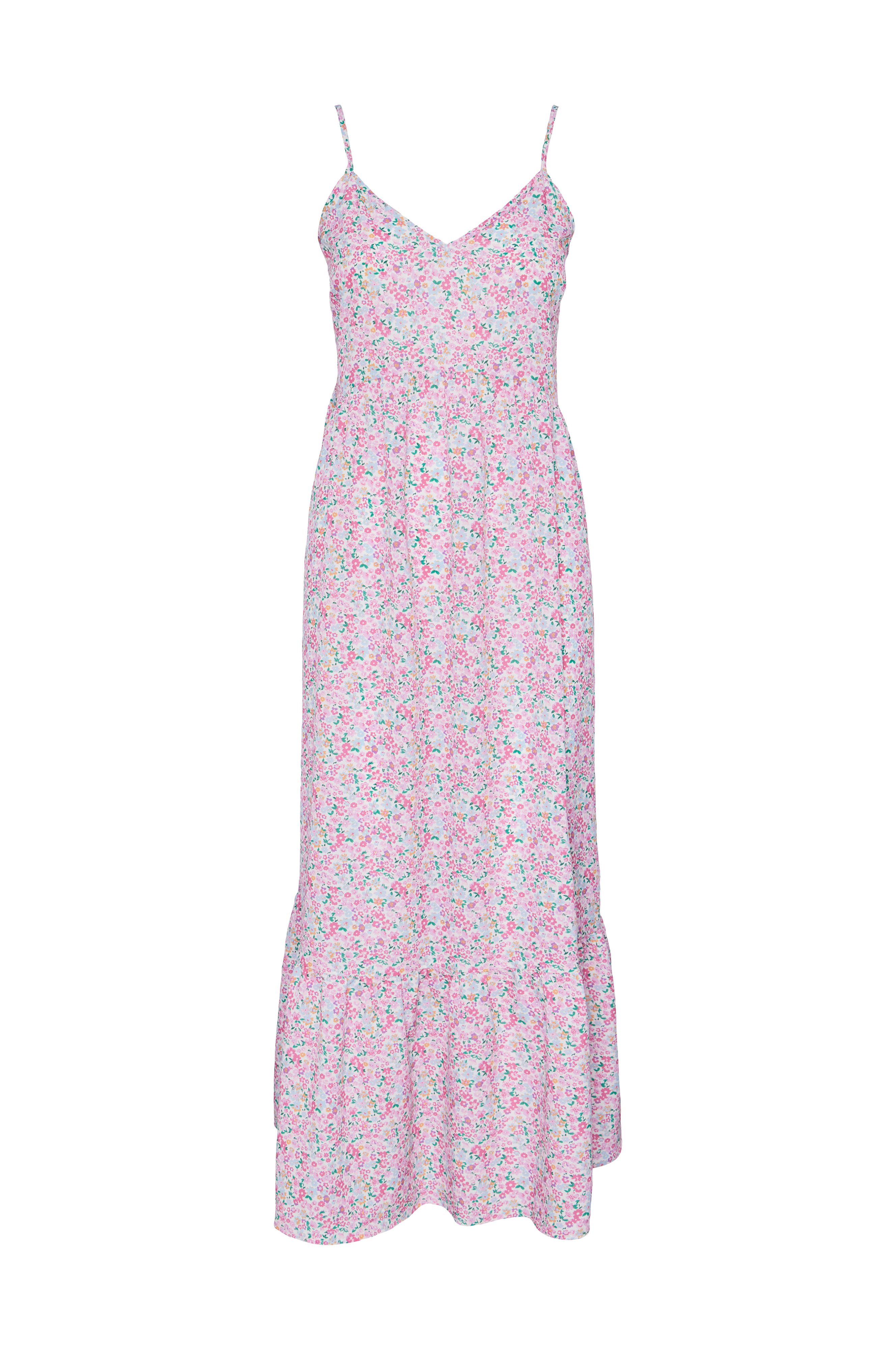 • Lang, ærmeløs kjole• Tynde, justérbare skulderstropper• V-udskæring• Rynket udskæring under brystet• Volant nederst• Længde: 133 cm i størrelse S