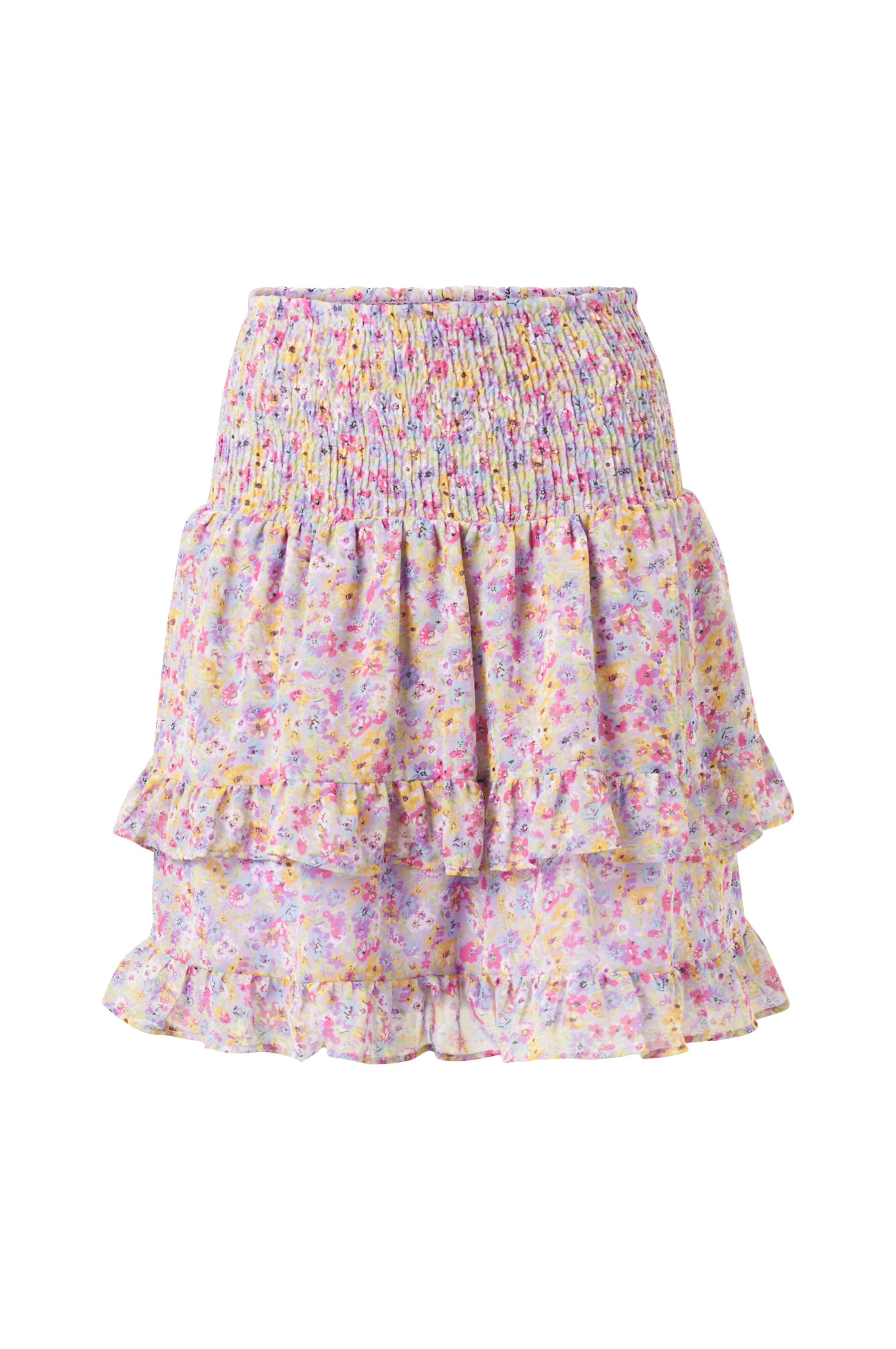 • Volantnederdel • Semitransparent materiale med printet mønster • For i strækjersey • Bred smock ved taljen • Længde: 50 cm i størrelse S • Produktet indeholder genindvundet materiale, som genbruges for at reducere mængden af affald samtidigt med at der ikke anvendes nye ressourcer.