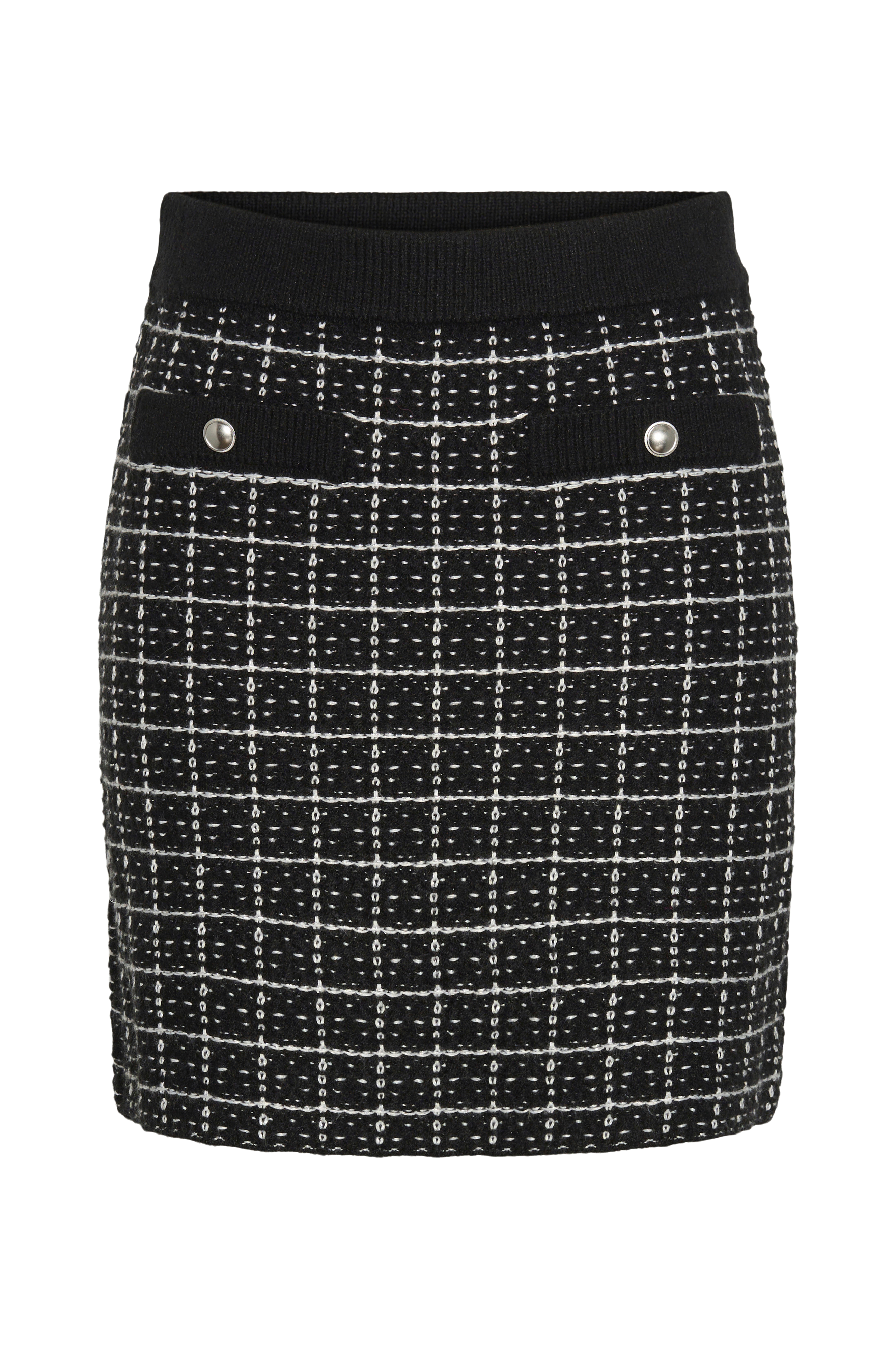 • Strukturstrikket nederdel med glimmertråd• Ribbet, elastisk talje• Snydelommer med metalknapper foran• Længde: 44 cm i størrelse S