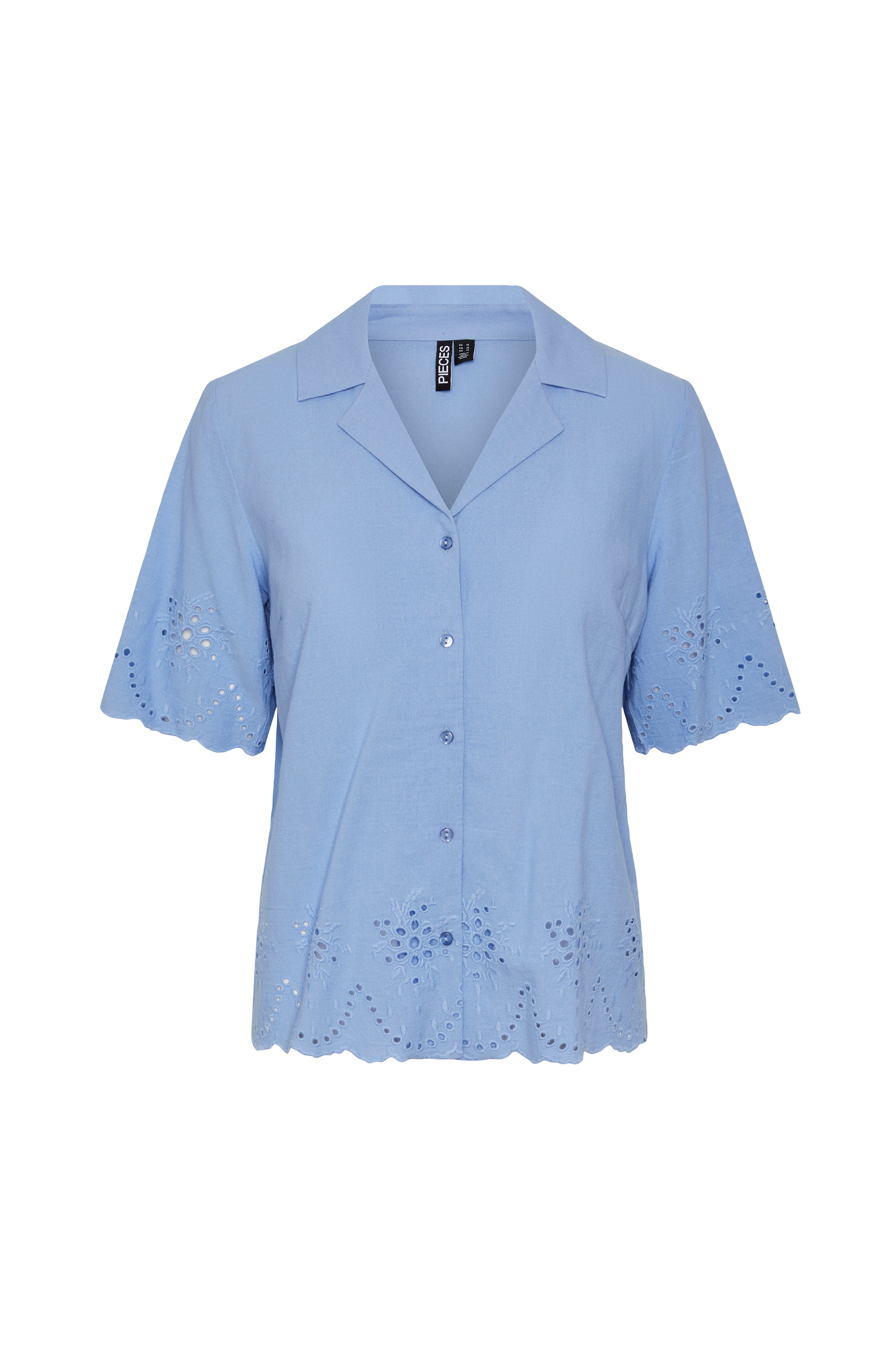 • Hulbroderet mønster nederst og ved manchetterne• Krave med revers• Knapper foran