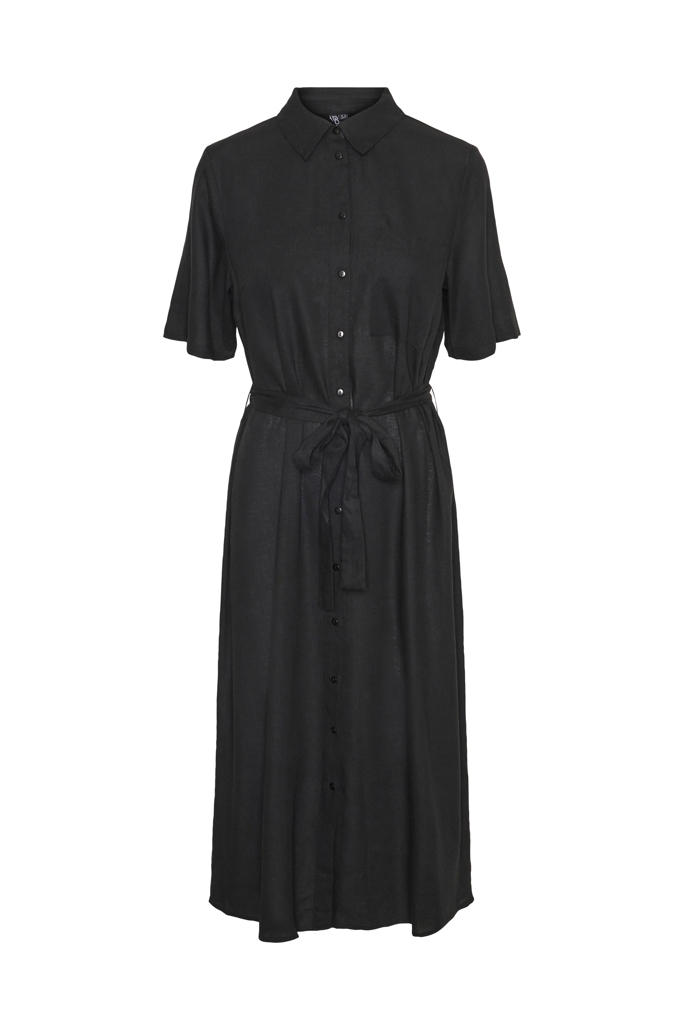 • Let udsvingende model i hørblanding• Lille krave• Knapper hele vejen frem• En brystlomme• Stropper med bindebælte ved taljen• Kort ærme• Længde: 114 cm i størrelse S