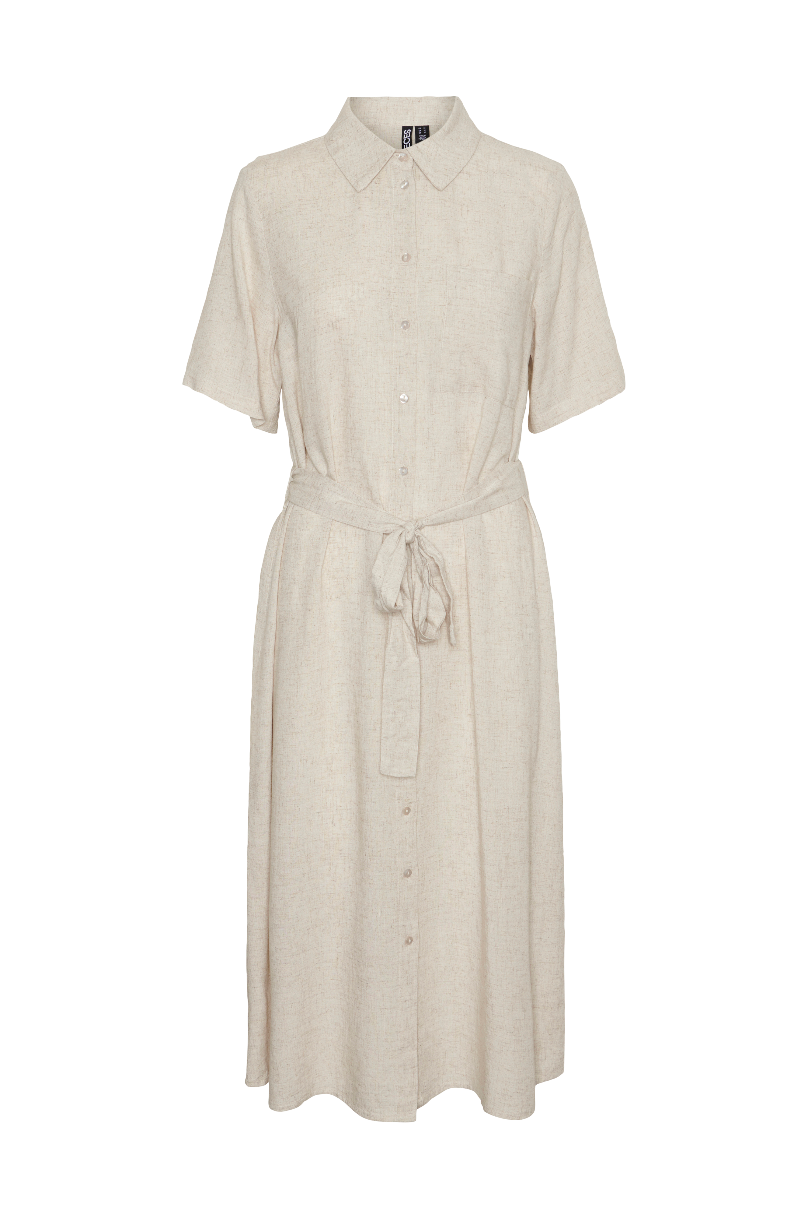 • Let udsvingende model i hørblanding• Lille krave• Knapper hele vejen frem• En brystlomme• Stropper med bindebælte ved taljen• Kort ærme• Længde: 114 cm i størrelse S
