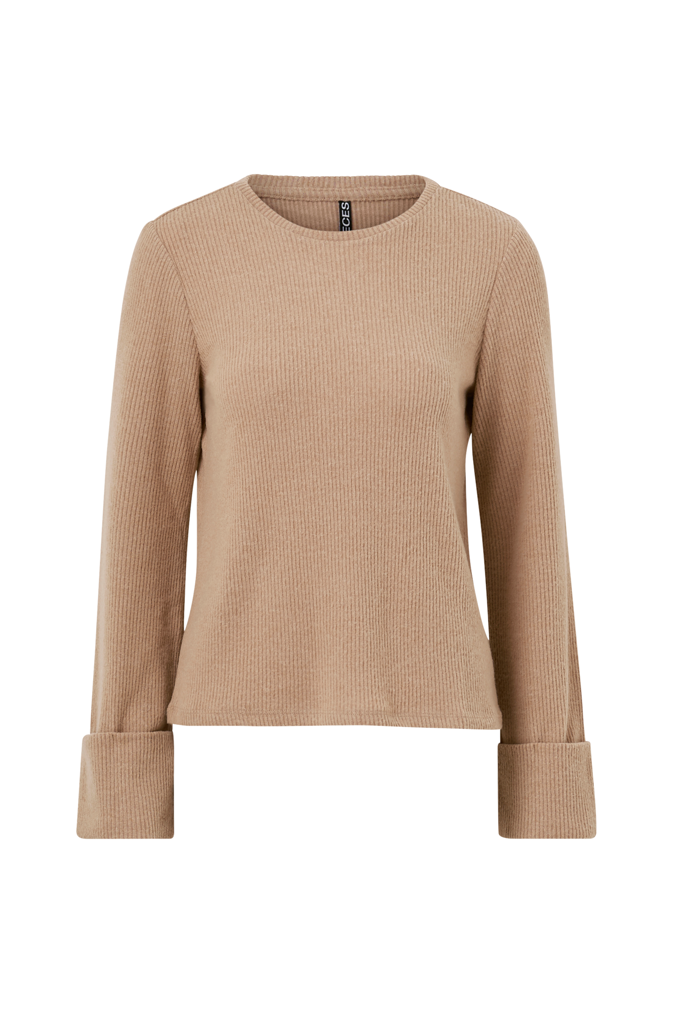 Top pcHermione LS Top fra Pieces. Lige model med ekstra langt, vidt ærme som har bredt, fast opslag i ærmekant. Rund hals med lille kant. Stretchjersey med lodden overflade og indvævede strukturstriber.