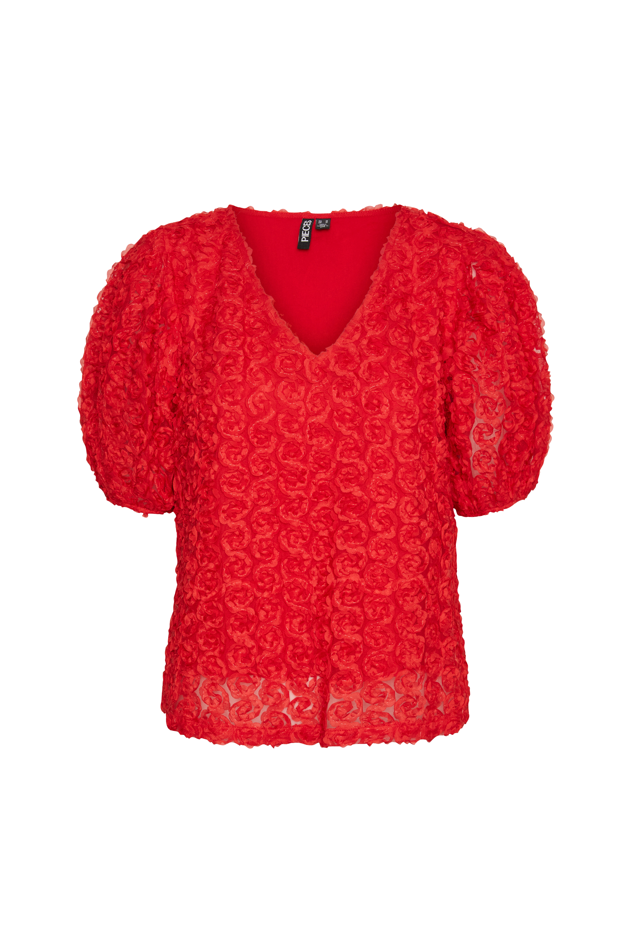 • Overdel i struktureret mesh med rosenformet mønster• Firkantet pasform• V-udskæring• Korte ballonærmer• Foret