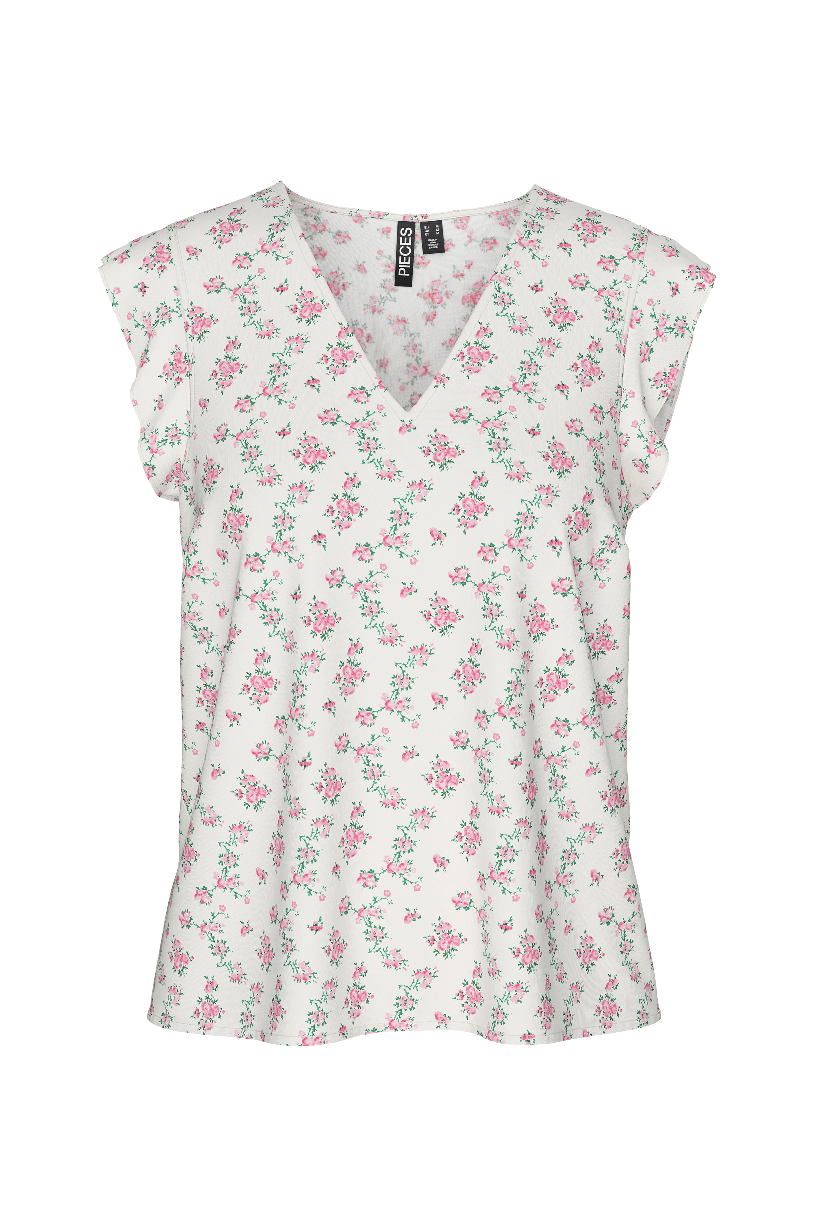 • Let udsvingende, ærmeløs model• V-formet halsudskæring• Lille volant over skuldrene• V-ringning