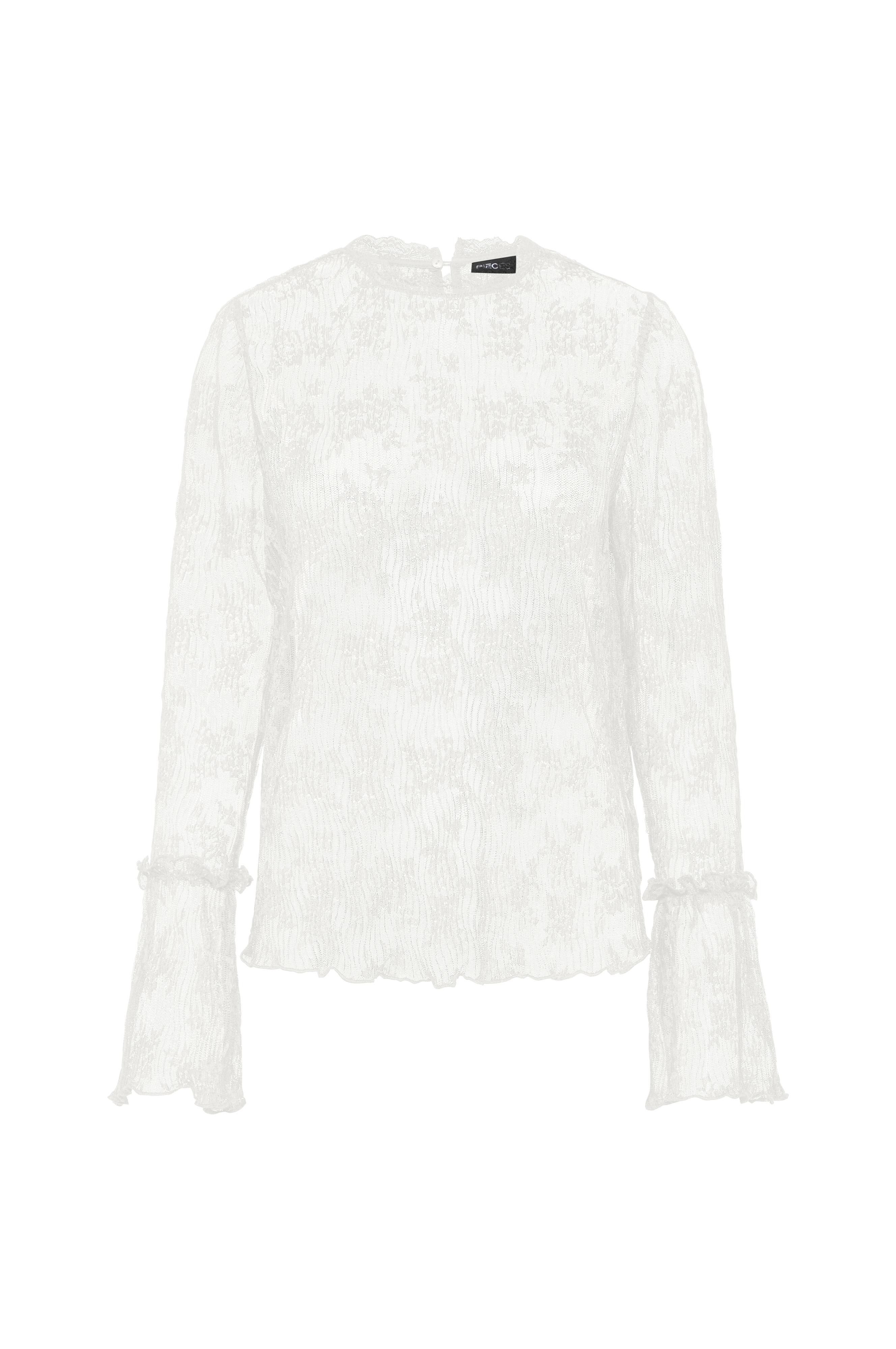 • Top i transparent, blondemønstret meshtrikot• Lange arme med flæsedesign ved ærmeafslutningerne• Afrundet halsudskæring med bølget kant• Åbning i nakken med lille knap• Bølget kant nederst og ved ærmeafslutningerne