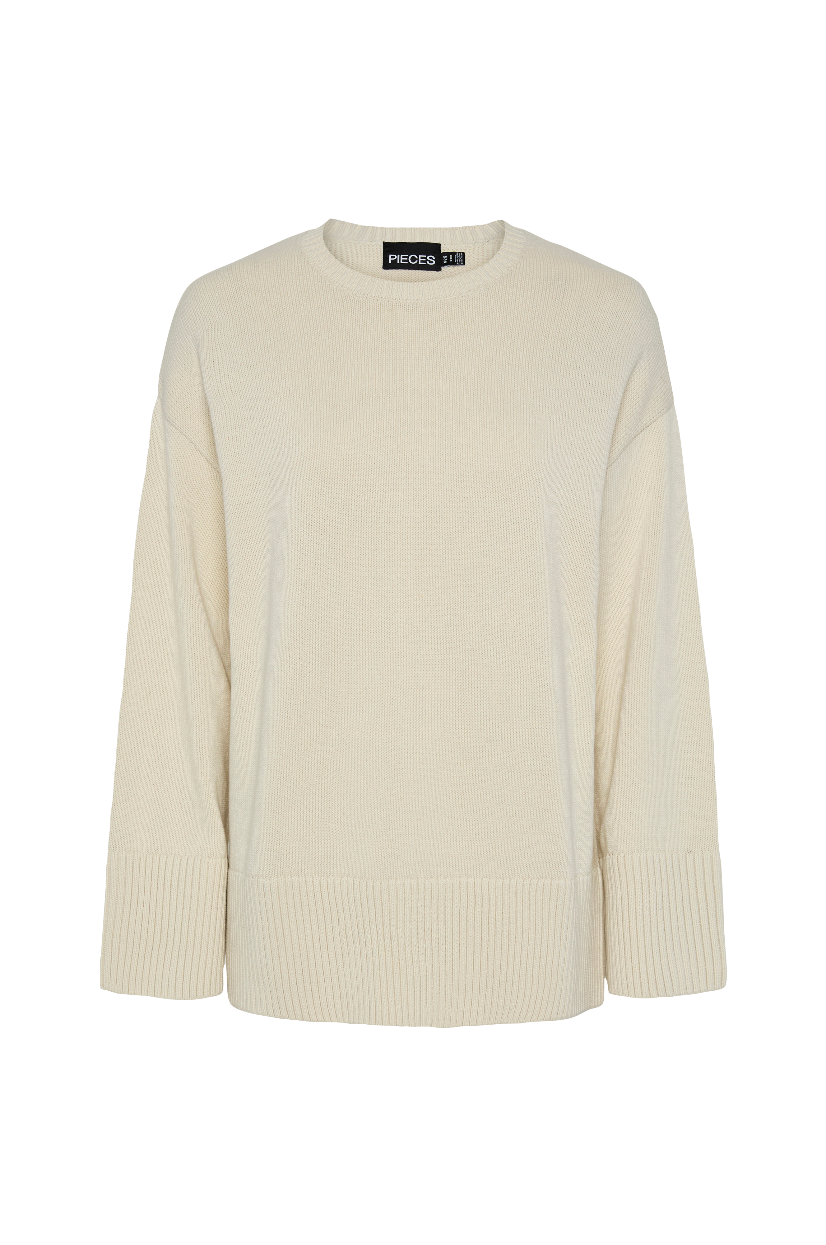 • Strikket trøje• Rund, ribbet halsudskæring• Nedsænkede skuldre• Slidser nede i siderne• Ribstrik ved manchetterne og nederst