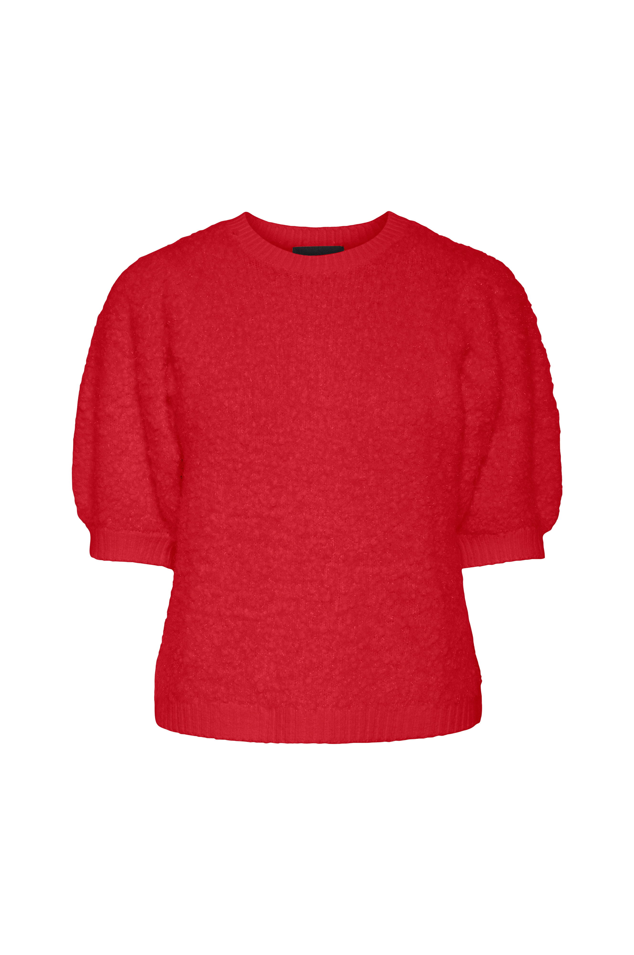 • Kortærmet, strikket trøje• Frynset, skinnende overflade• Ribstrik ved manchetterne, nederst og i halsen