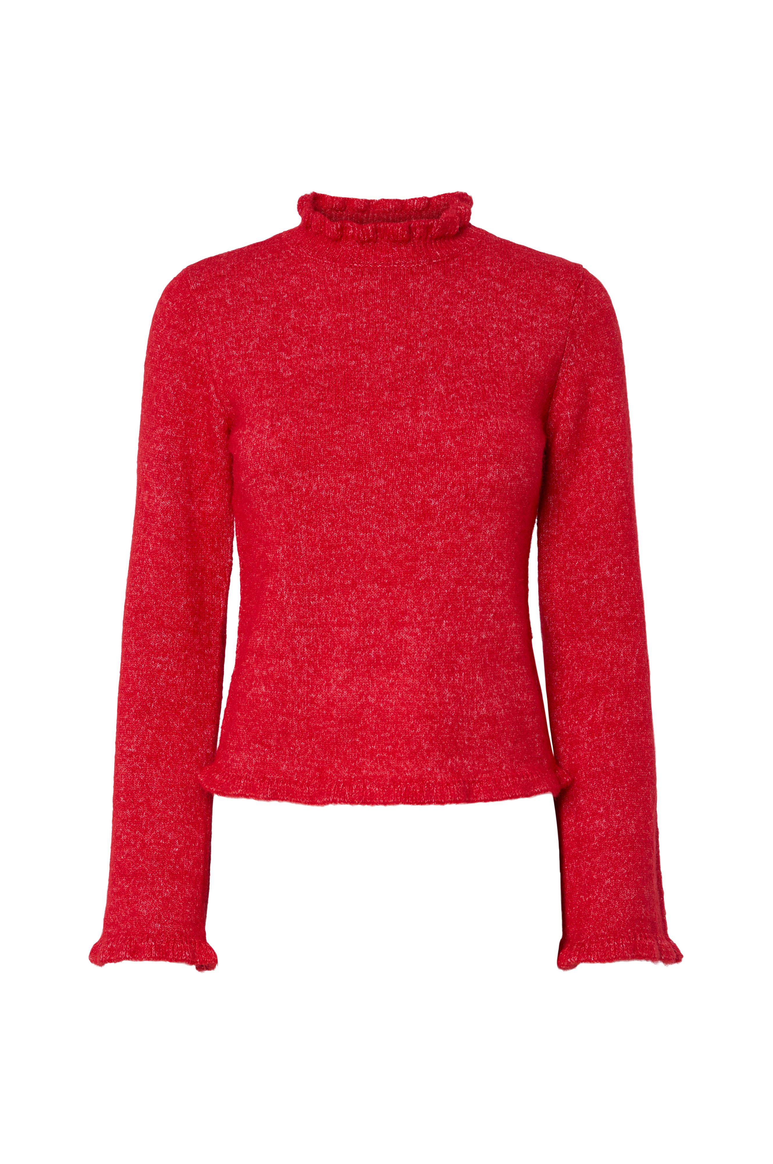 • Blød, strikket trøje i uldmiks• Rund, ribbet halsudskæring• Volanter ved manchetterne, nederst og rundt om halsen• Lange ærmer med svaj