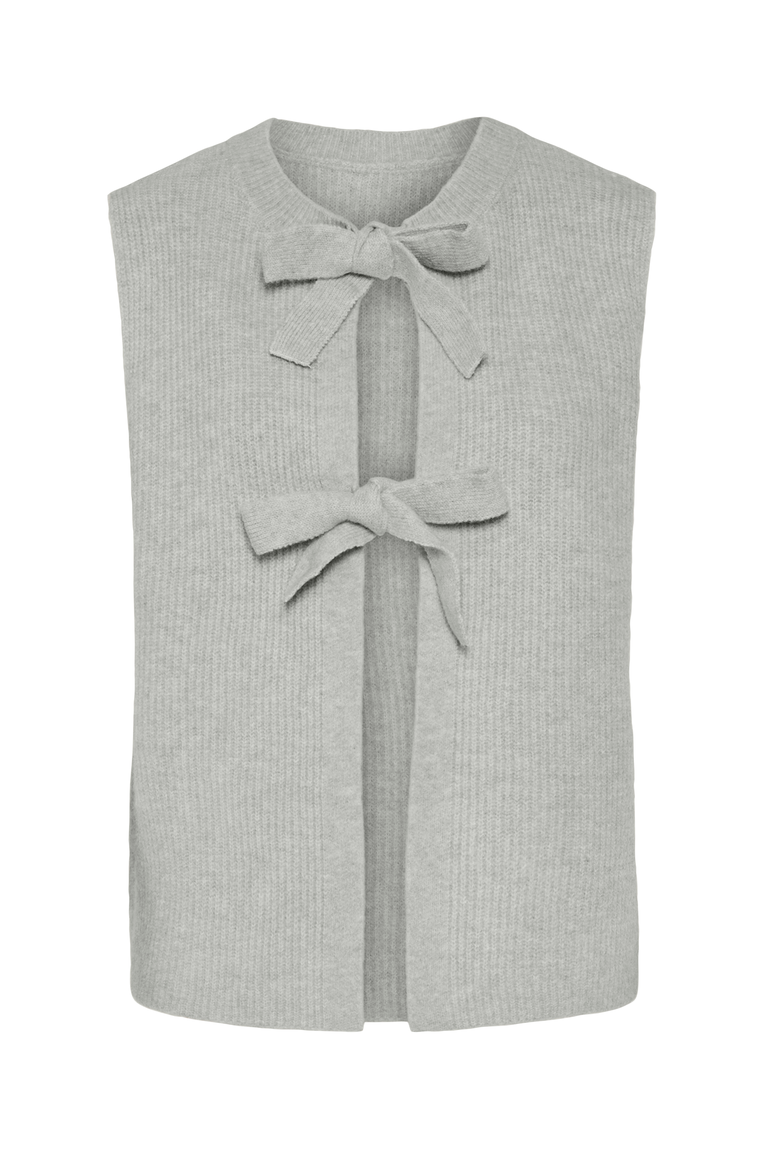 • Lige model• Rund hals med ribkant• Strikkede bindebånd foran