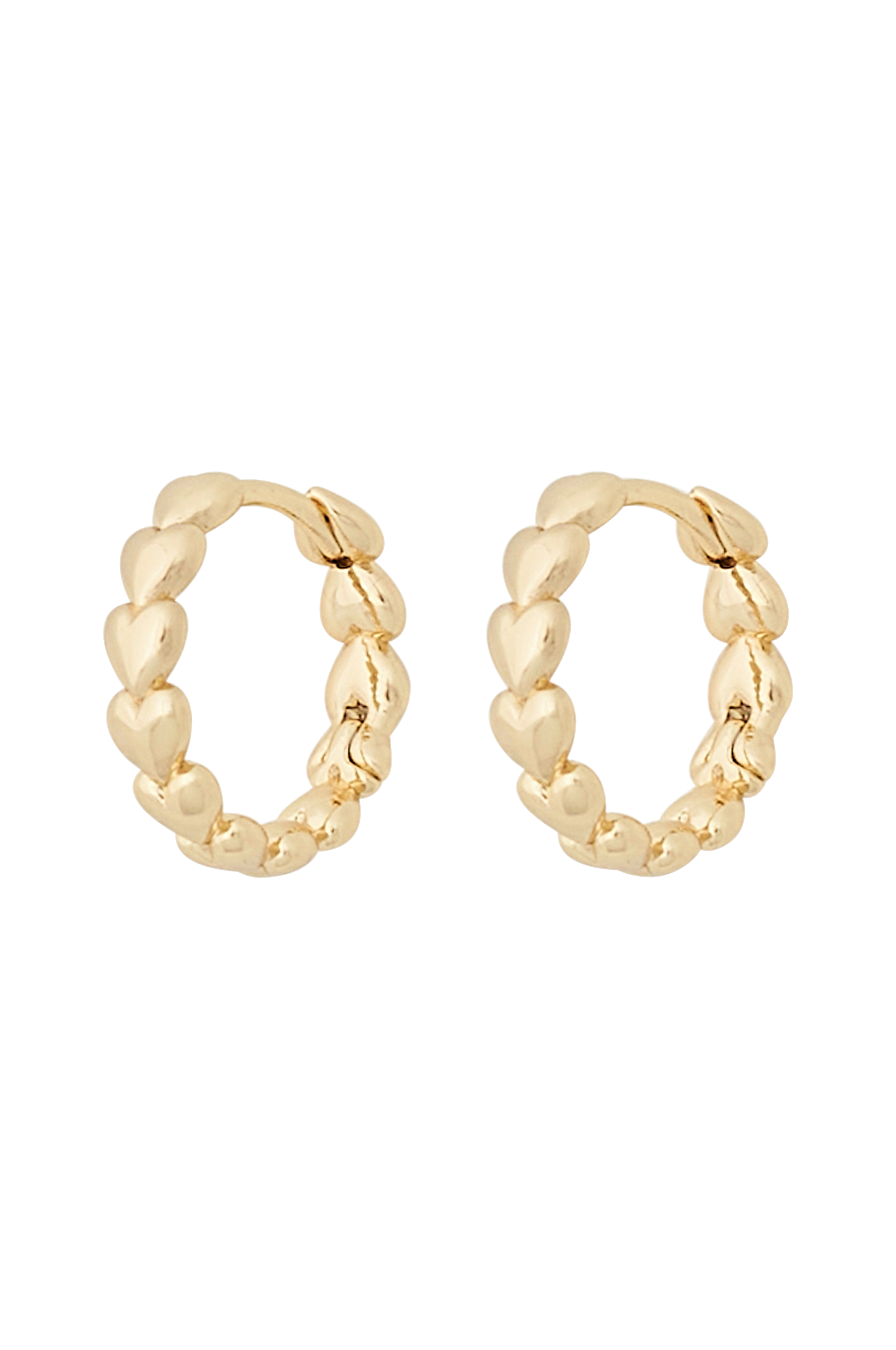 Elsk dig selv! De guldbelagte Maeve hoops fra Pilgrim har et charmerende hjertedesign, som gør dem til en uundværlig tilføjelse til din smykkesamling. Et sæt klassiske evergreens, som kan bruges til alt. Sæt dem sammen med flere guldsmykker for et trendy stacked look, eller brug dem alene for en sofistikeret, ubesværet chic vibe. Øreringene har brugervenlige kliklåse, som gør dem utroligt enkle at bære. Lad dit hjerte lede dig, når vores øreringe sætter gang i dine drømme og giver næring til dine eventyr. De er lavet af 99 % genbrugsmaterialer og er et stylingvalg, du kan være stolt af.