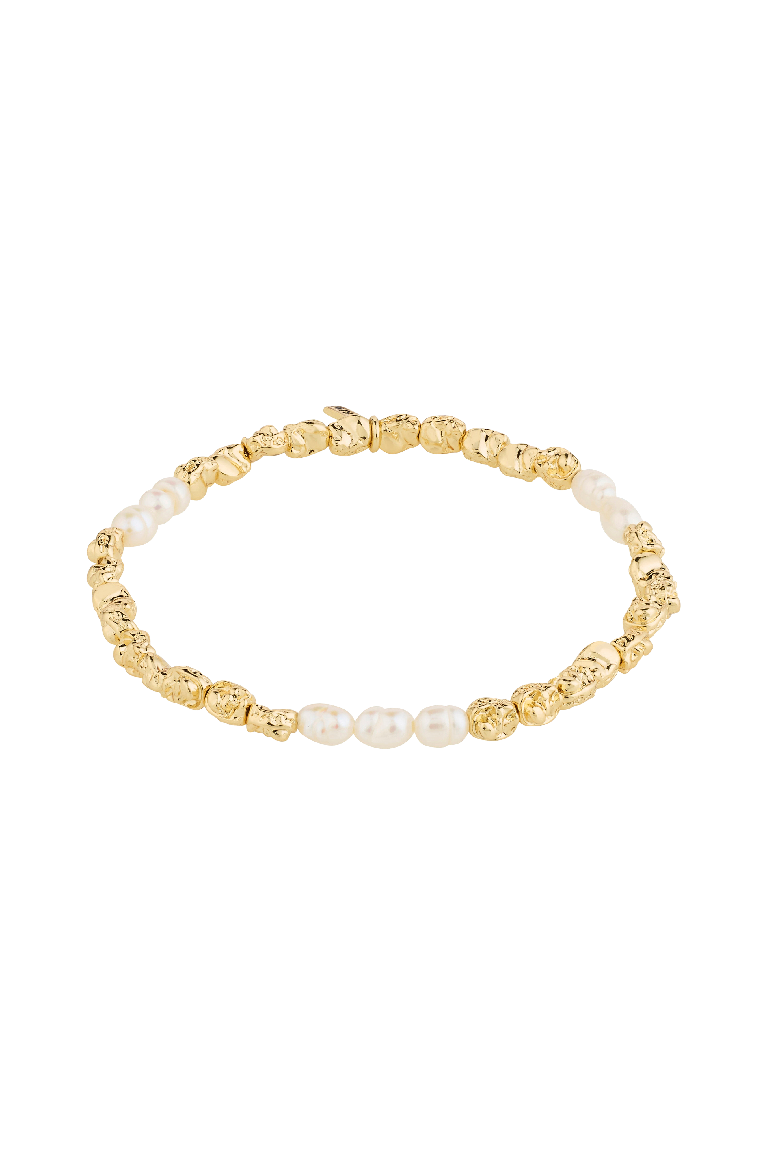 Stol på dine drømmes tide! Guldbelagt Tide armbånd fra Pilgrims Imagination kollektion. Armbåndet er udformet i et organisk, fritflydende design med luksuriøse guldbelagte perler kombineret med en levende blanding af ægte ferskvandsperler og skinnende perlemorsglasperler. Løft din stil med dette legende og elegante tilbehør! Lad detaljerne i dette armbånd skinne, og sæt det sammen med andre for at få et friskt, personligt forårslook. Pak dit håndled ind i denne sæsons must-have-accessory, og hav det godt med at vide, at det er lavet af mindst 88% genbrugsmaterialer med vores planet i tankerne. Armbåndet er lavet med en holdbar lycra-elastik og passer til de fleste håndled. Det måler 17 cm.