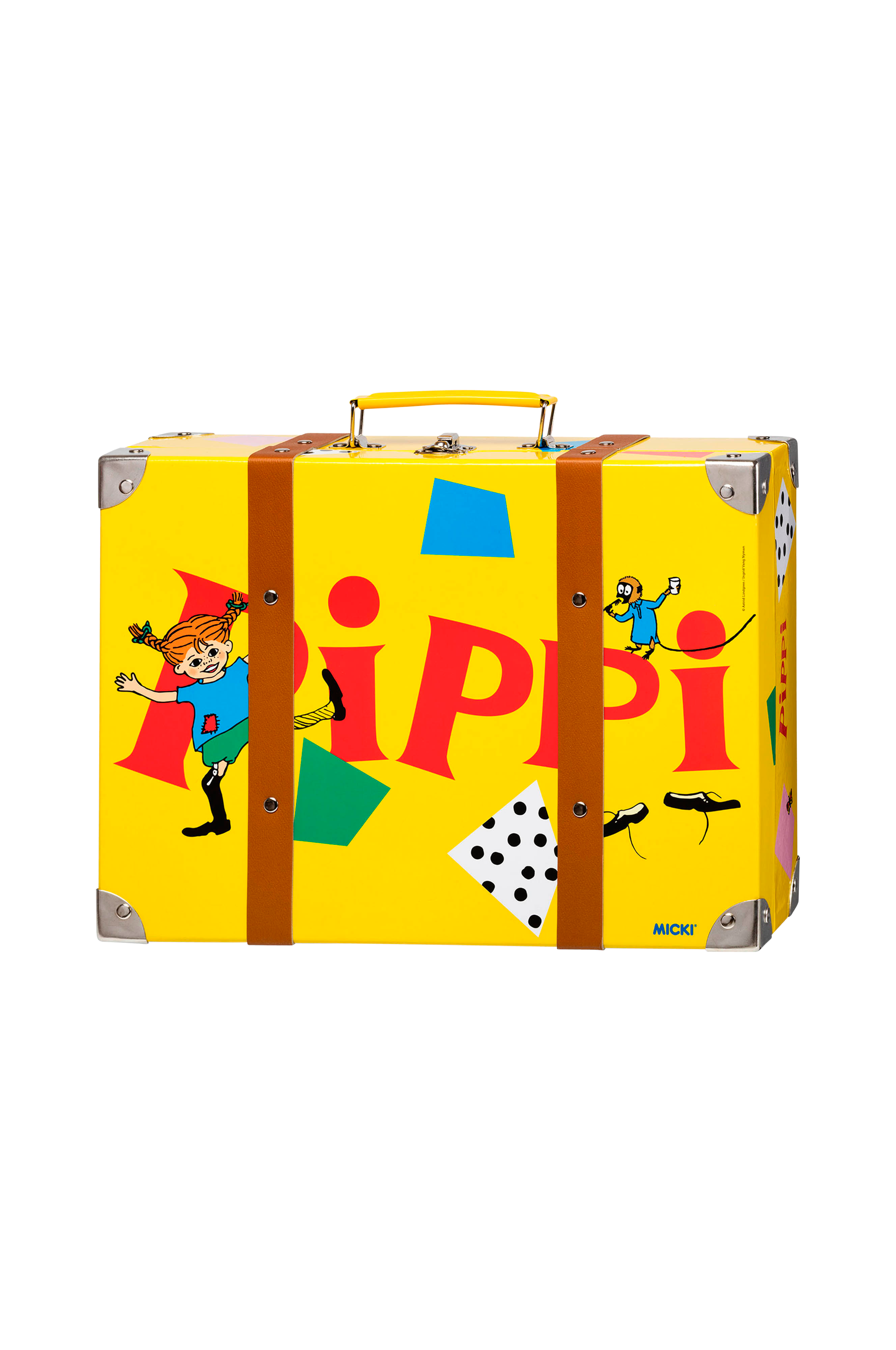 Denne Pippi-taske har billeder af Pippi Langstrømpe på ydersiden og tekster og billeder fra de klassiske Pippi-bøger på indersiden. Der er også en etiket med plads til at skrive navn, så man ved, hvem Pippi-kufferten tilhører.