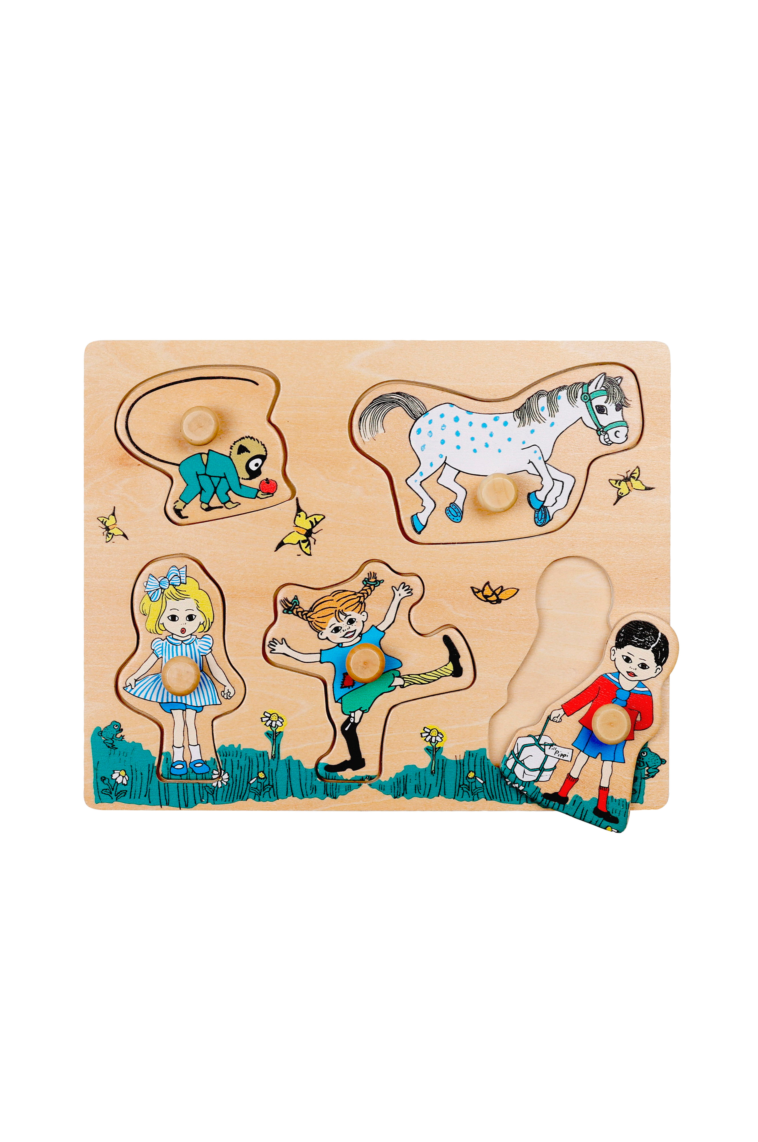 Med brikkernes gribbare knopper og de genkendelige illustrationer inspirerer dette puslespil til sjov leg. Puslespillet indeholder 5 dele med store træknopper. Med Pippi, Tommy, Annika, Lilla Gubben og Herr Nilsson bliver dette smarte træpuslespil en succes med de små børn, der elsker Pippi Langstrømpe!