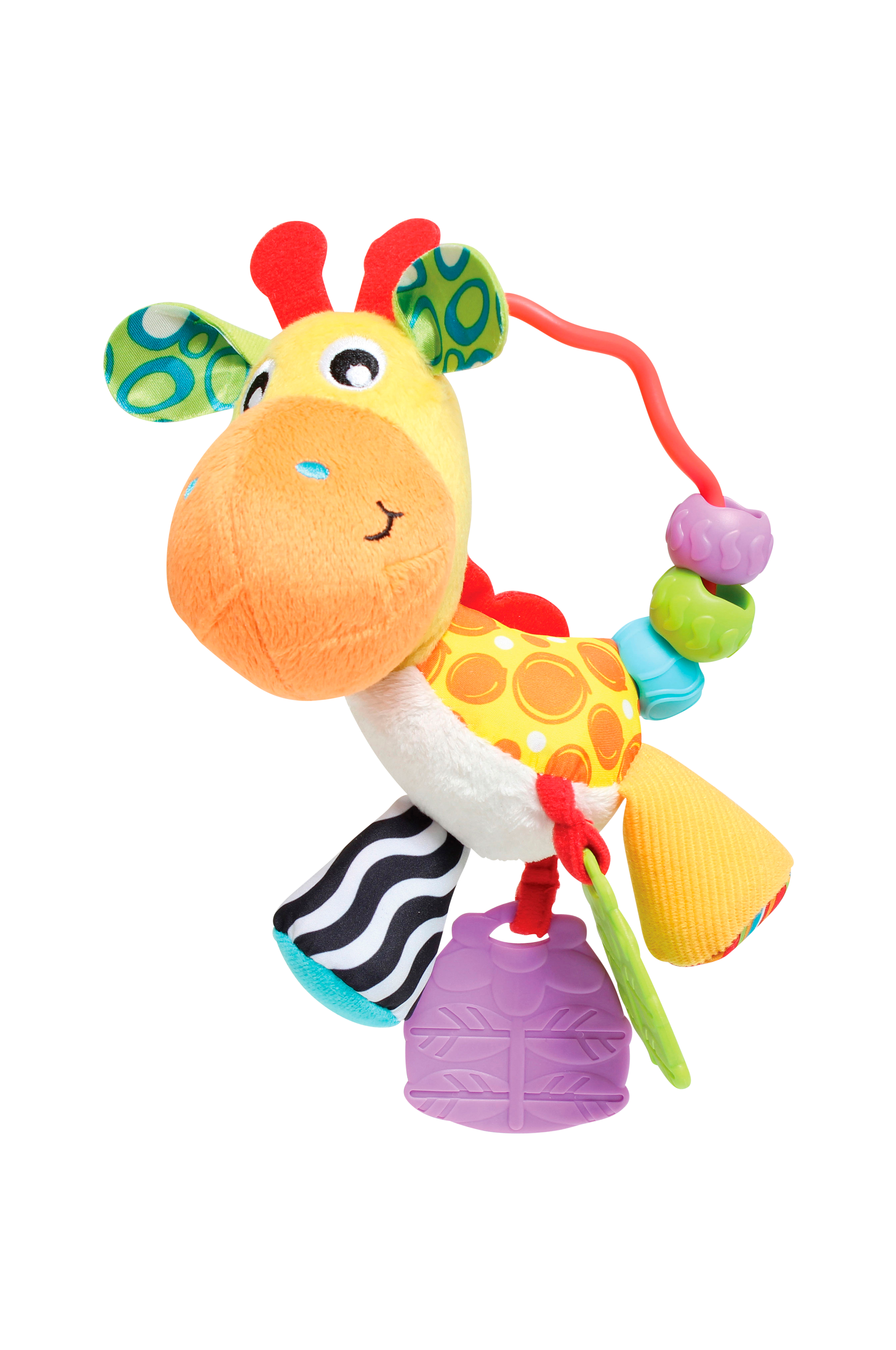 Blød legetøjsgiraf i glade farver og med aktiviteter og bidelegetøj.