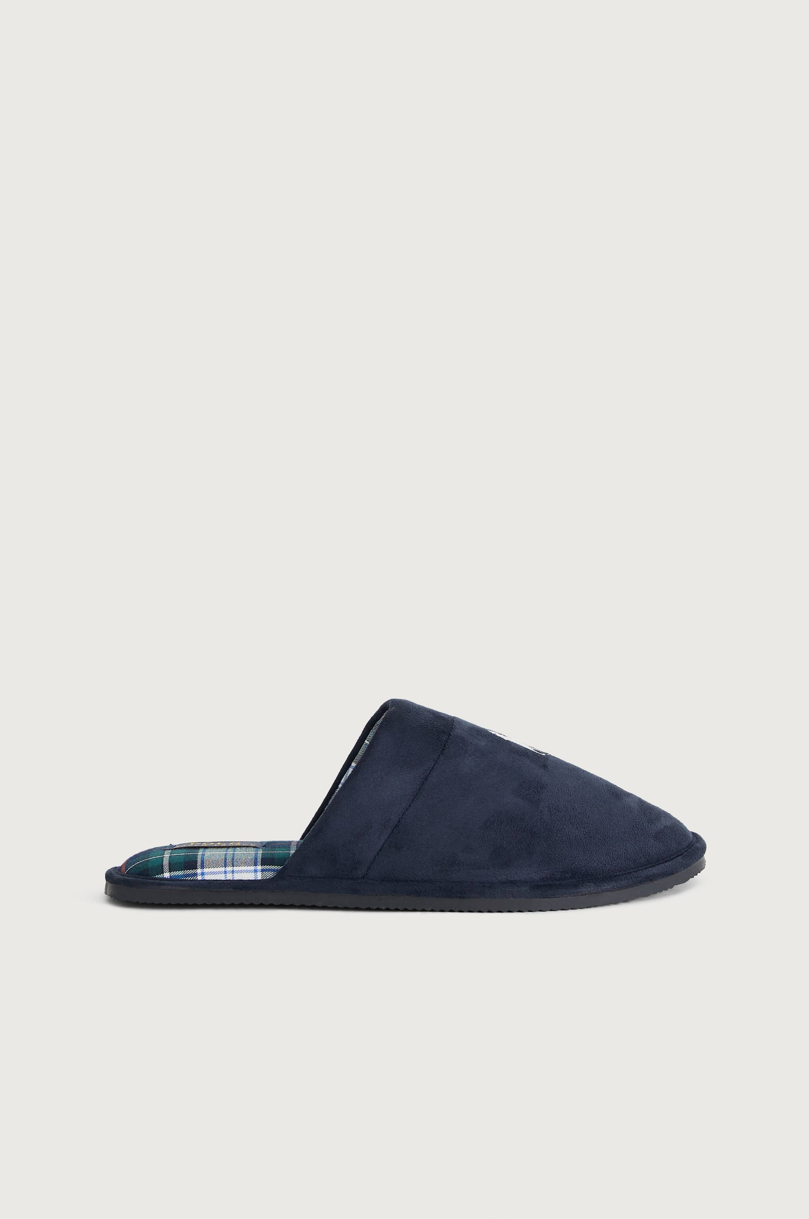 Hjemmesko i slip on-model i blød, ruskindslignende kvalitet med broderet logo foran. Blødt polstret fodseng og klassisk ternet for. Ydersål i gummi.