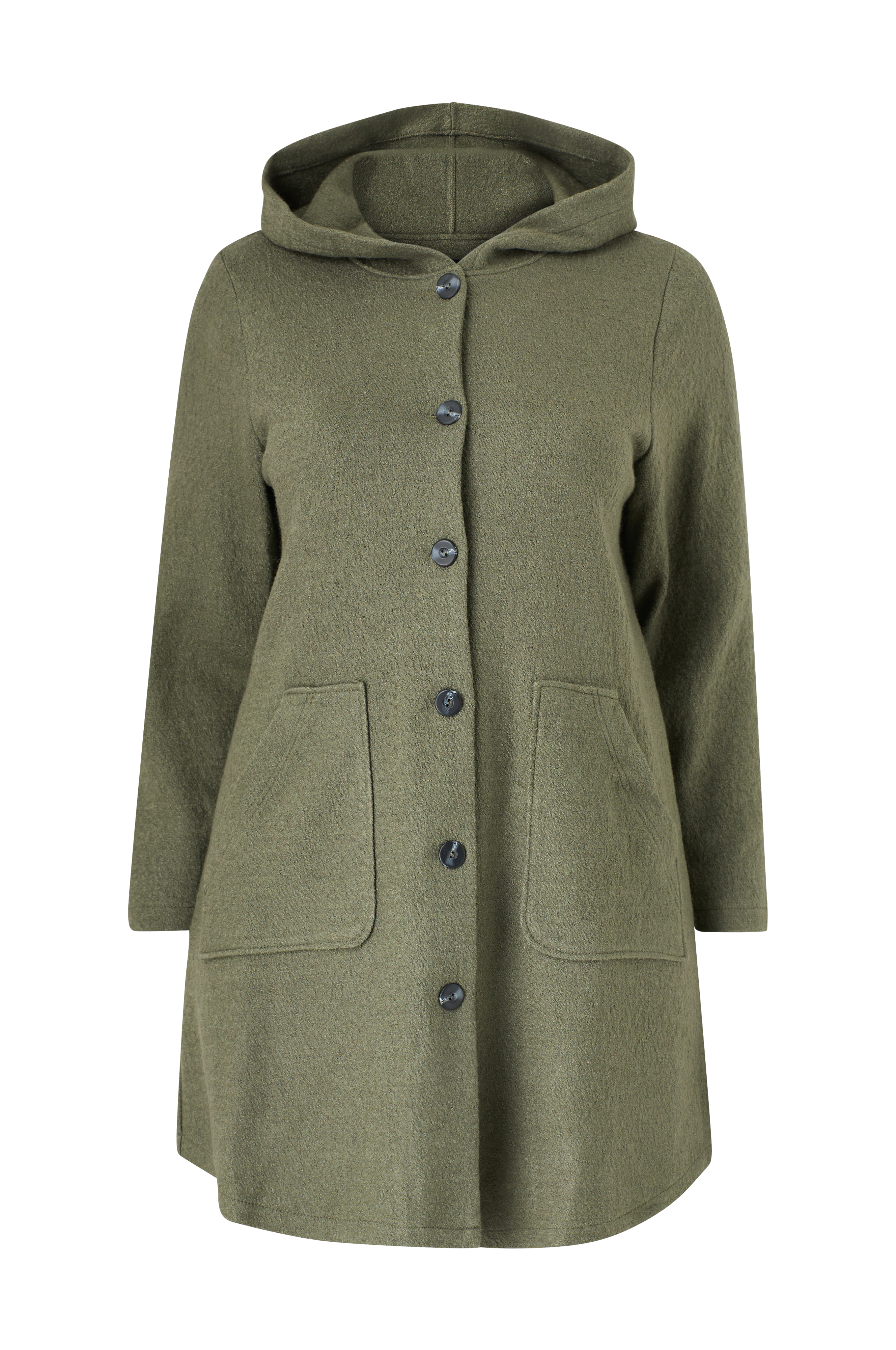 • Frakke i uldmiks med hætte• Knapstolpe foran• To lommer foran• Afrundet søm• Plusstørrelser• Længde: 100 cm i størrelse M