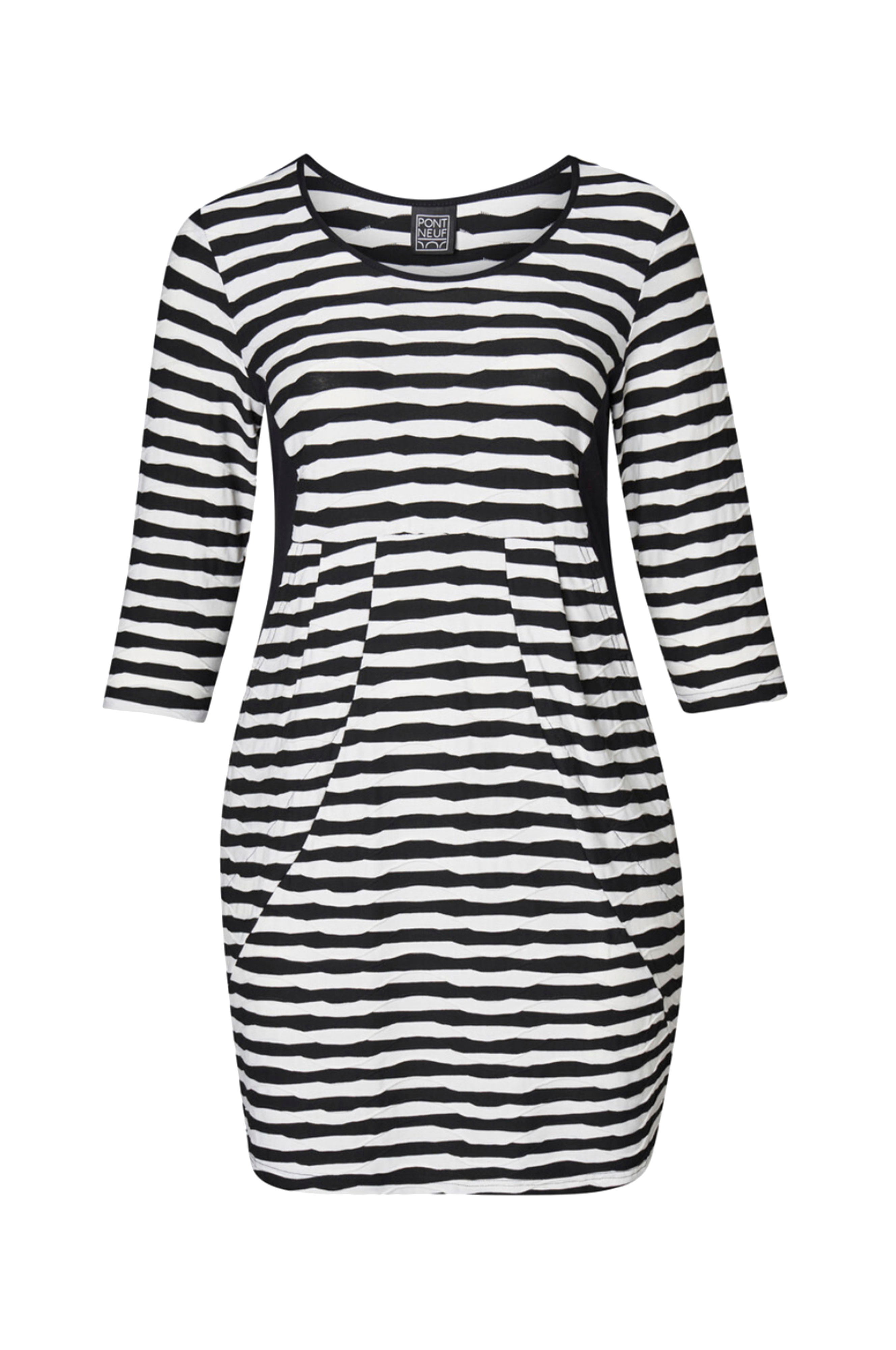 • Stribet kjole med strukturmønster• 3/4 lange ærmer• Lommer foran• Store størrelser• Længde: 104 cm i størrelse XL