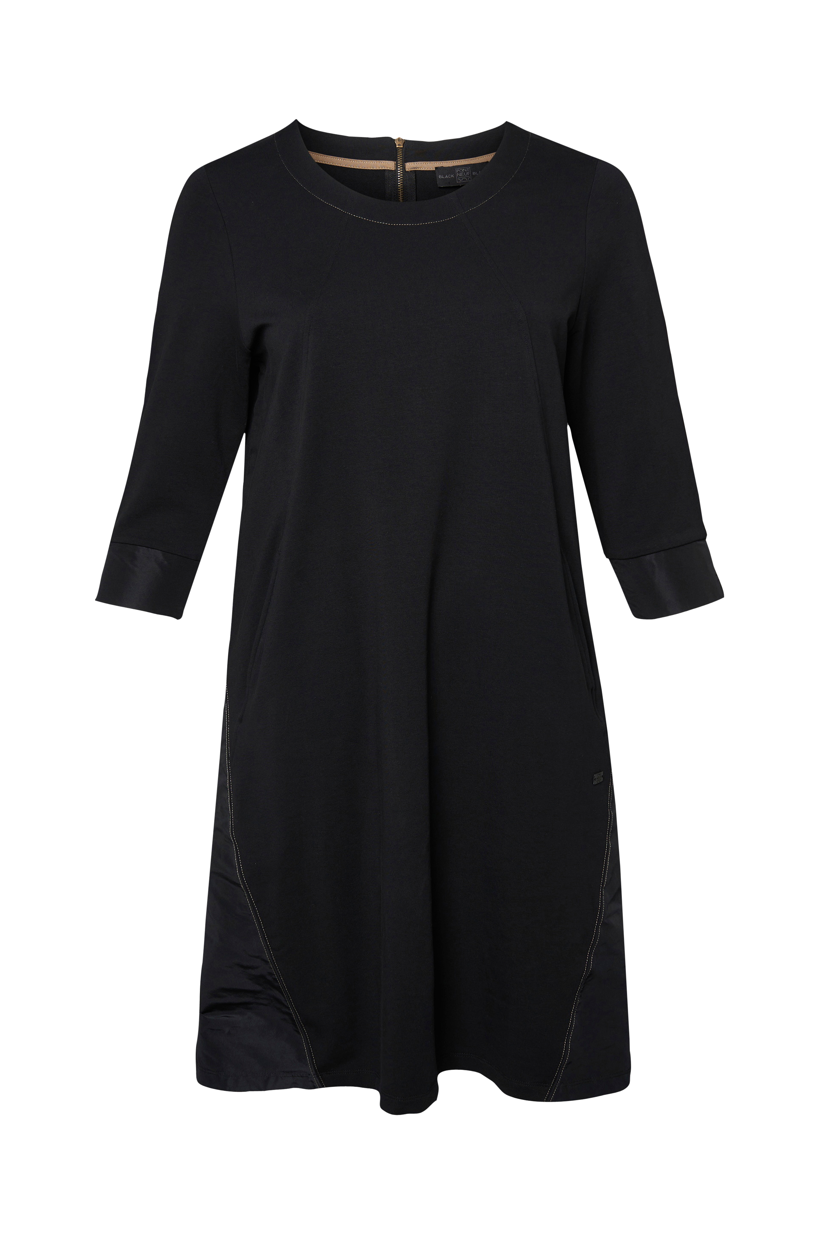 • Store størrelser• Model med svaj med diagonale dekorative sømme og indlagte lommer foran• Rund hals med bred søm• Lige, 3/4 langt ærme• Indlæg nederst på siden• Længde: 108 cm i størrelse XL