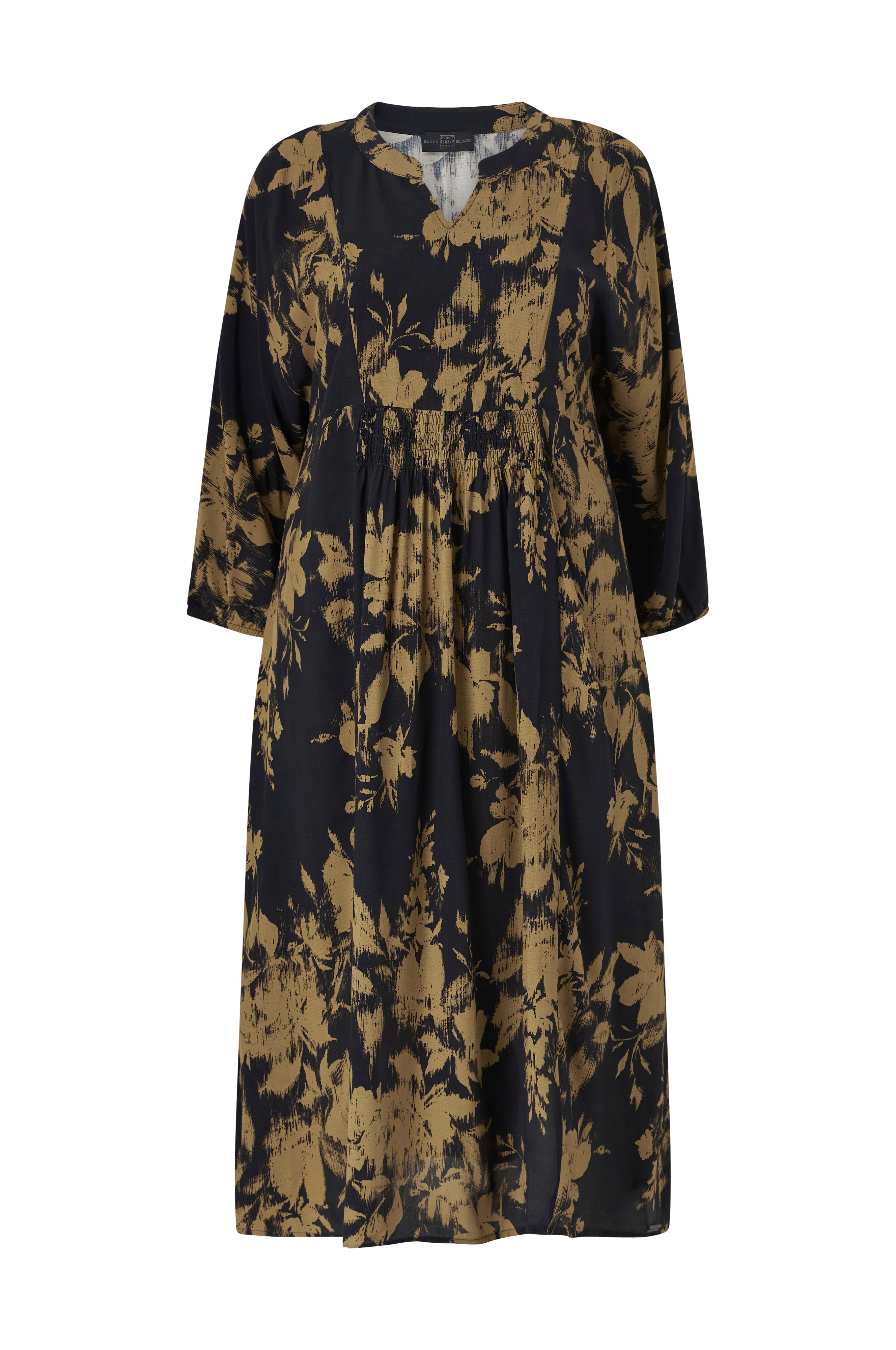 • Store størrelser• Bred model med svaj• Rund hals med lille ventilation foran• Bredt kimonoærme med elastik ved manchetterne• Markeret talje med smockdetalje midt foran• Længde: 129 cm i størrelse M