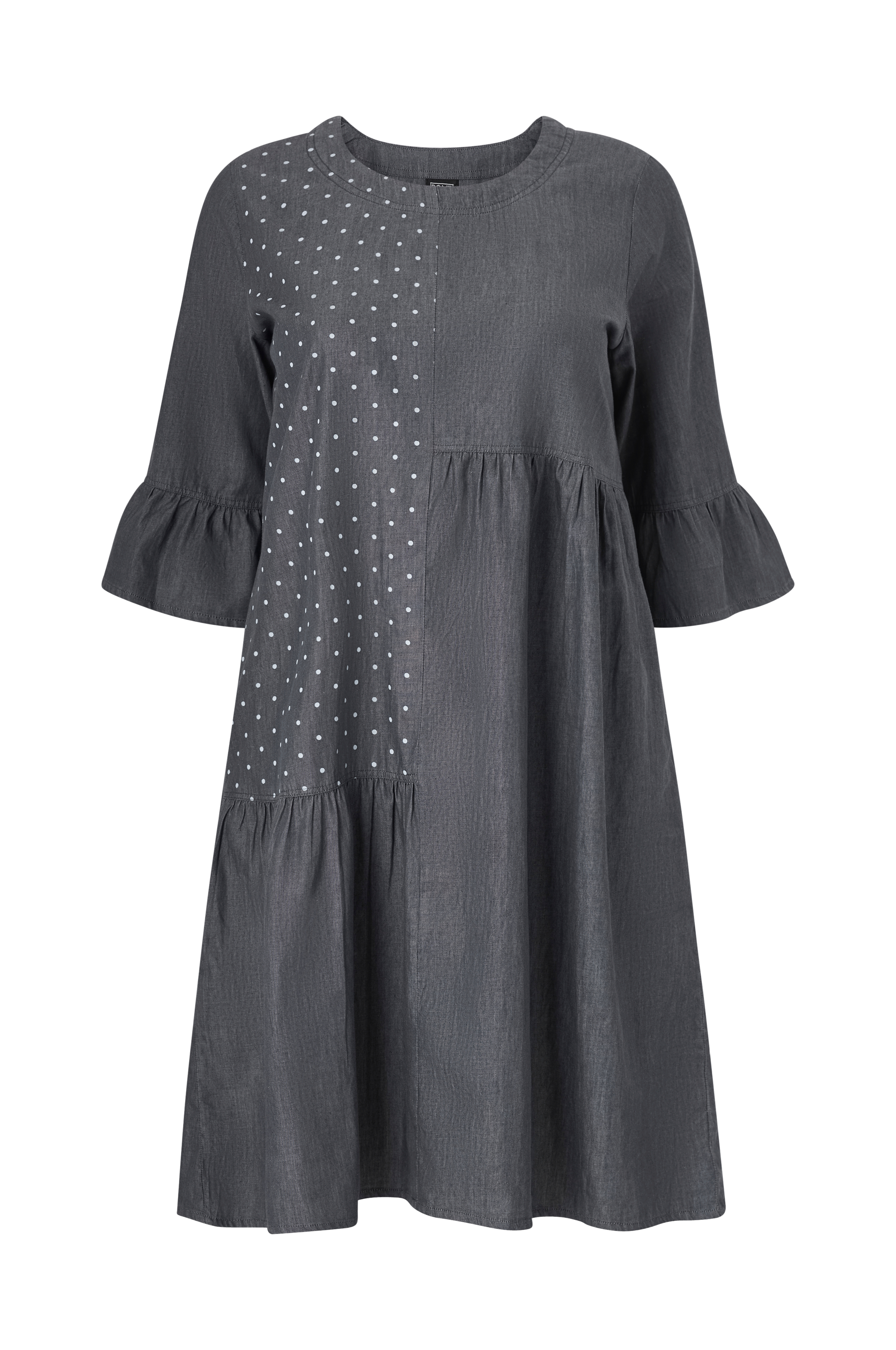 • Store størrelser• Let udsvingende model• Rund hals• 3/4 langt ærme med volant ved manchetterne• Linning med samling bagpå• Længde: 108 cm i størrelse M