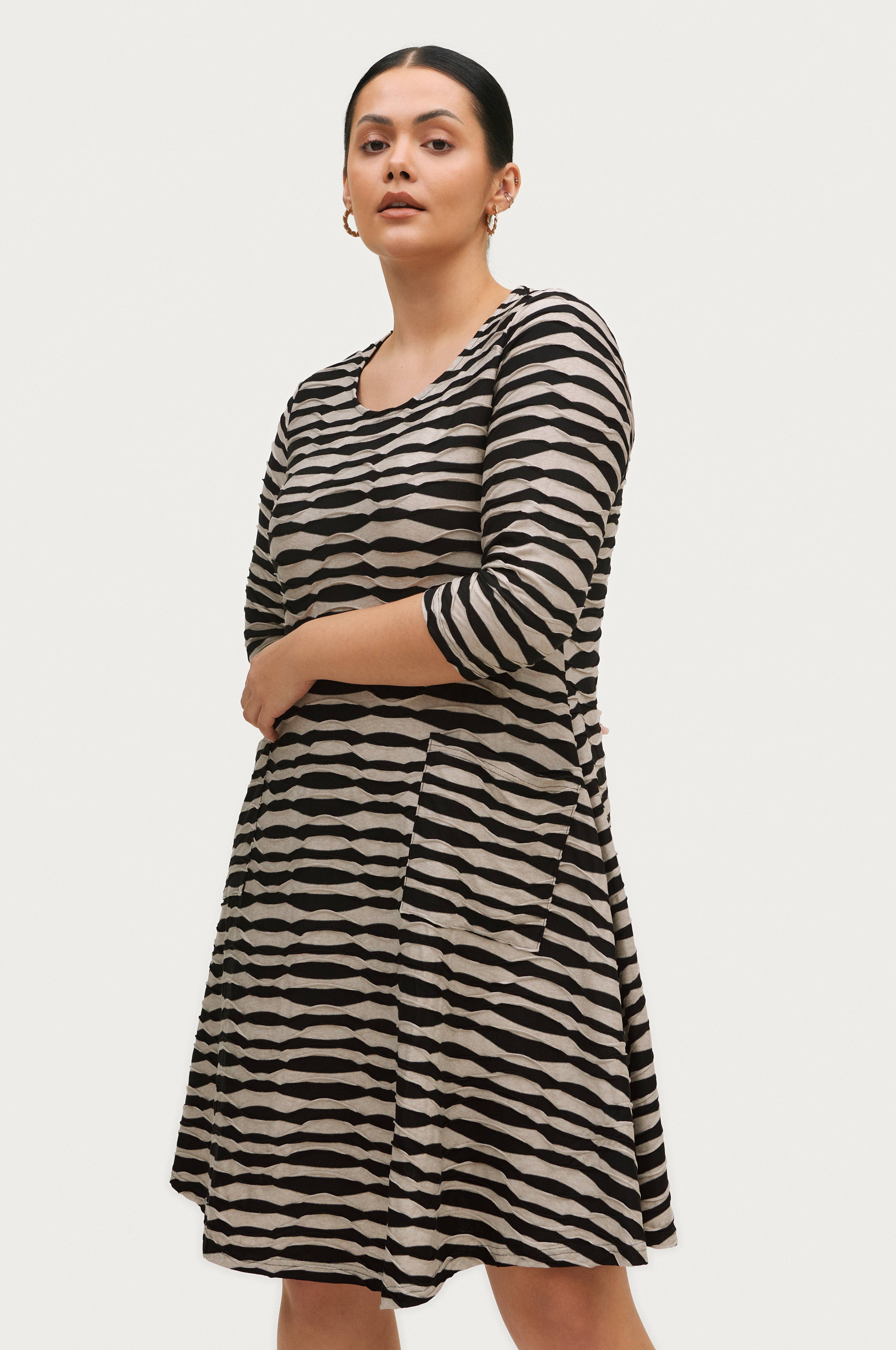 • Model med svaj i jersey med dekorative sømme overalt • Rund hals • 3/4 langt, lige ærme • Klokkeformet nederdel • Påsyede lommer foran • Længde: 106 cm i størrelse M
