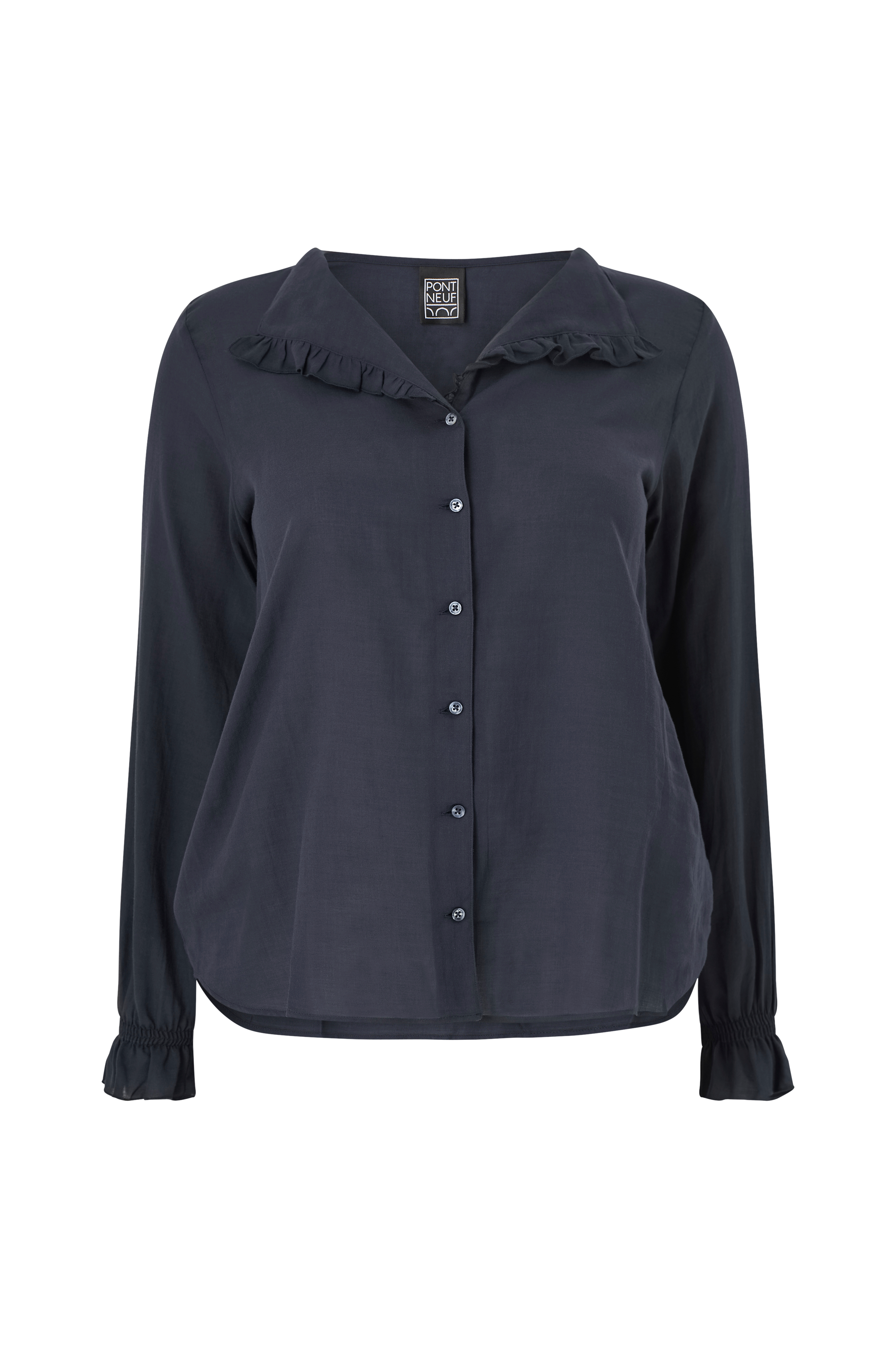 • Skjorte i bomuld• V-formet halsudskæring med flæsekant foran• Lange ærmer• Elastik med volant ved manchetterne• Store størrelser