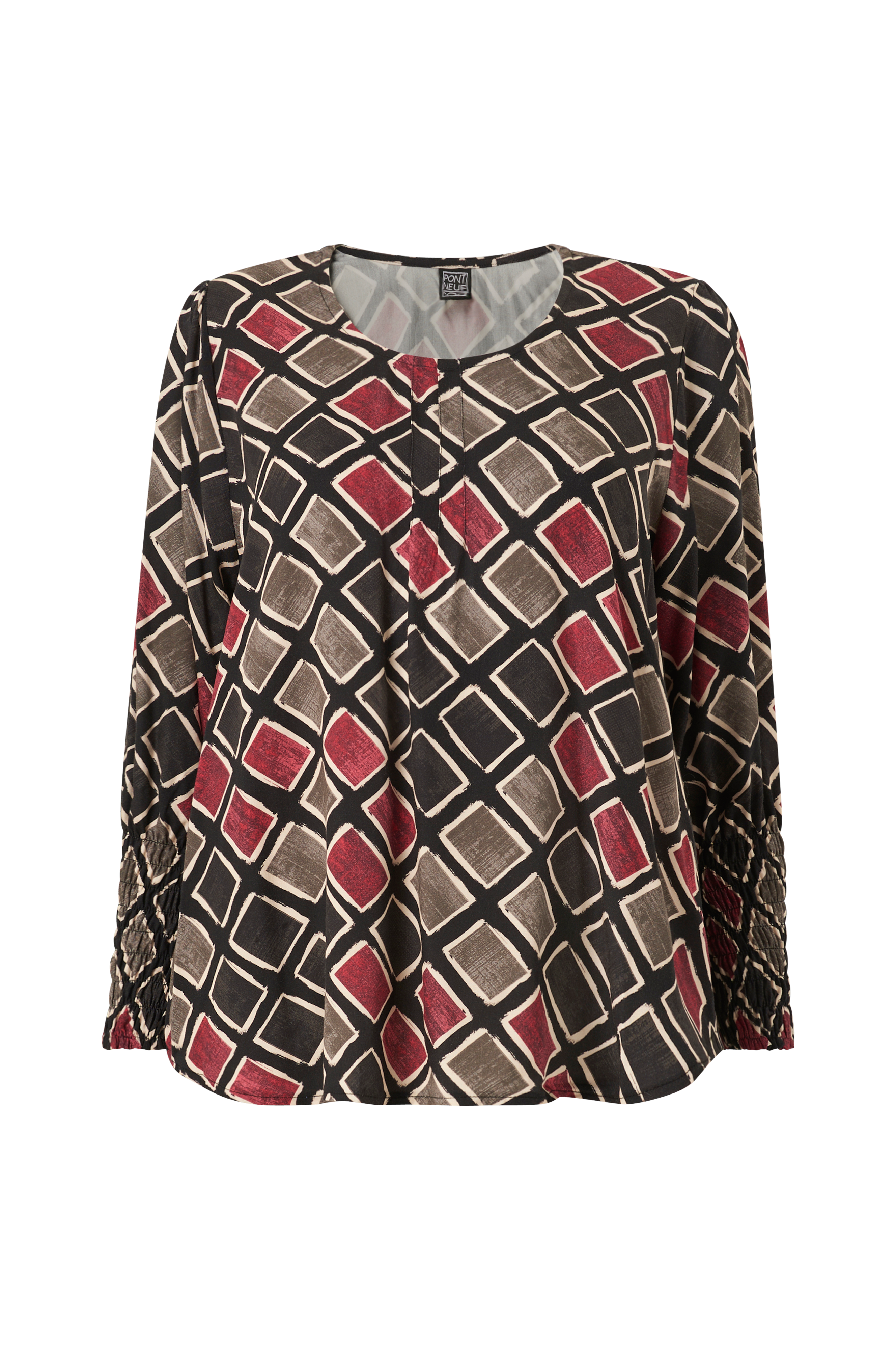 • Store størrelser• Uformel, lige model• Rund hals med dekorative sømme foran• Langt ærme med bred smock ved manchetterne• Let afrundet søm