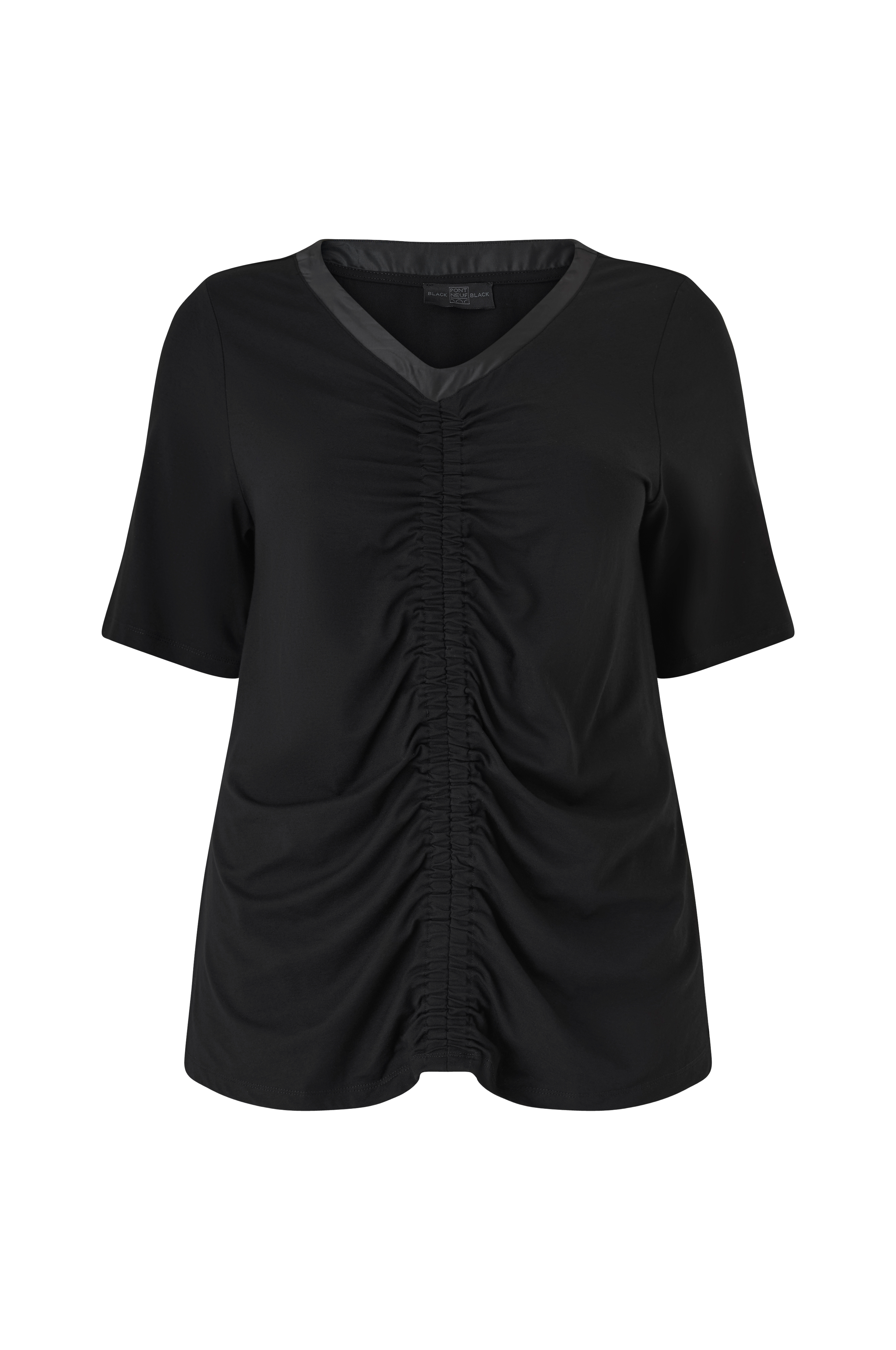 • Store størrelser• Lige model• V-formet halsudskæring med vævet kant• Kort ærme• Elastisk drapering foran