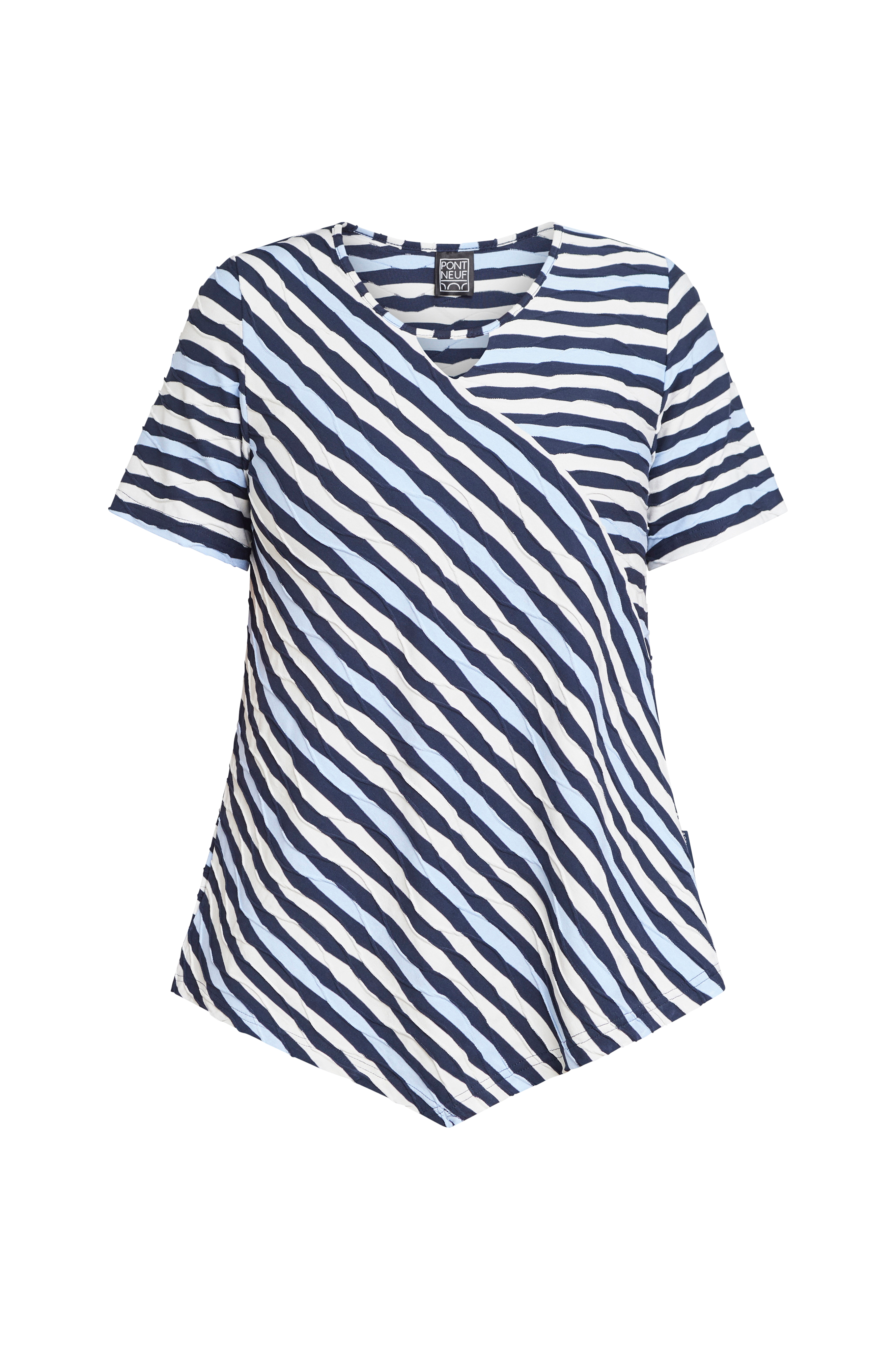 • Elastisk, kortærmet top• Rund halsudskæring med v-formet udskæringsdetalje• Bølget strukturmønster• V-formet søm• Store størrelser