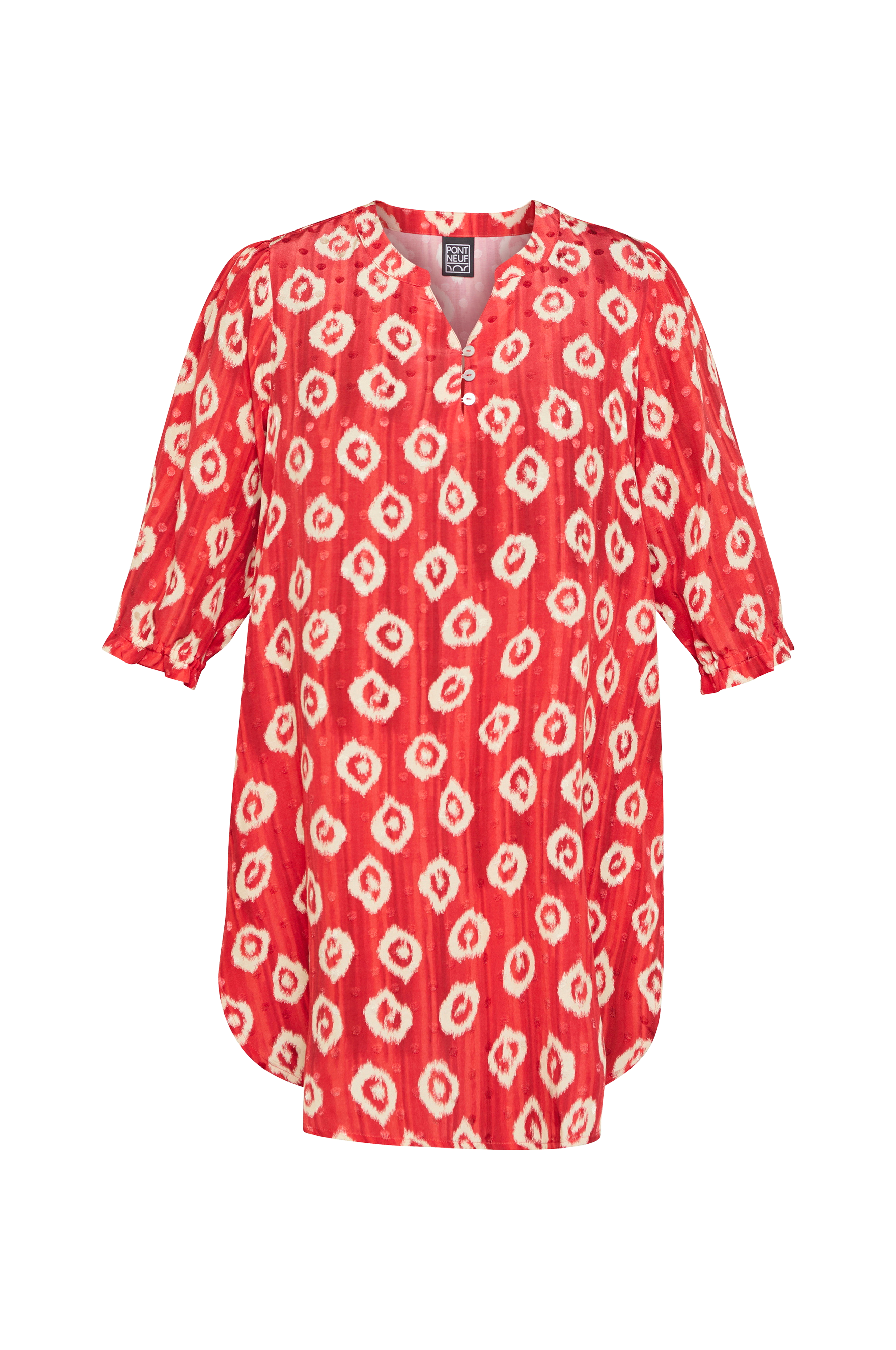 • Mønstret tunika i viskose• Rund halsudskæring• Slids foran med knapstolpe• 3/4 lange ærmer• Sidelommer• Afrundet søm med slids i siderne• Store størrelser• Længde: 90 cm i størrelse M
