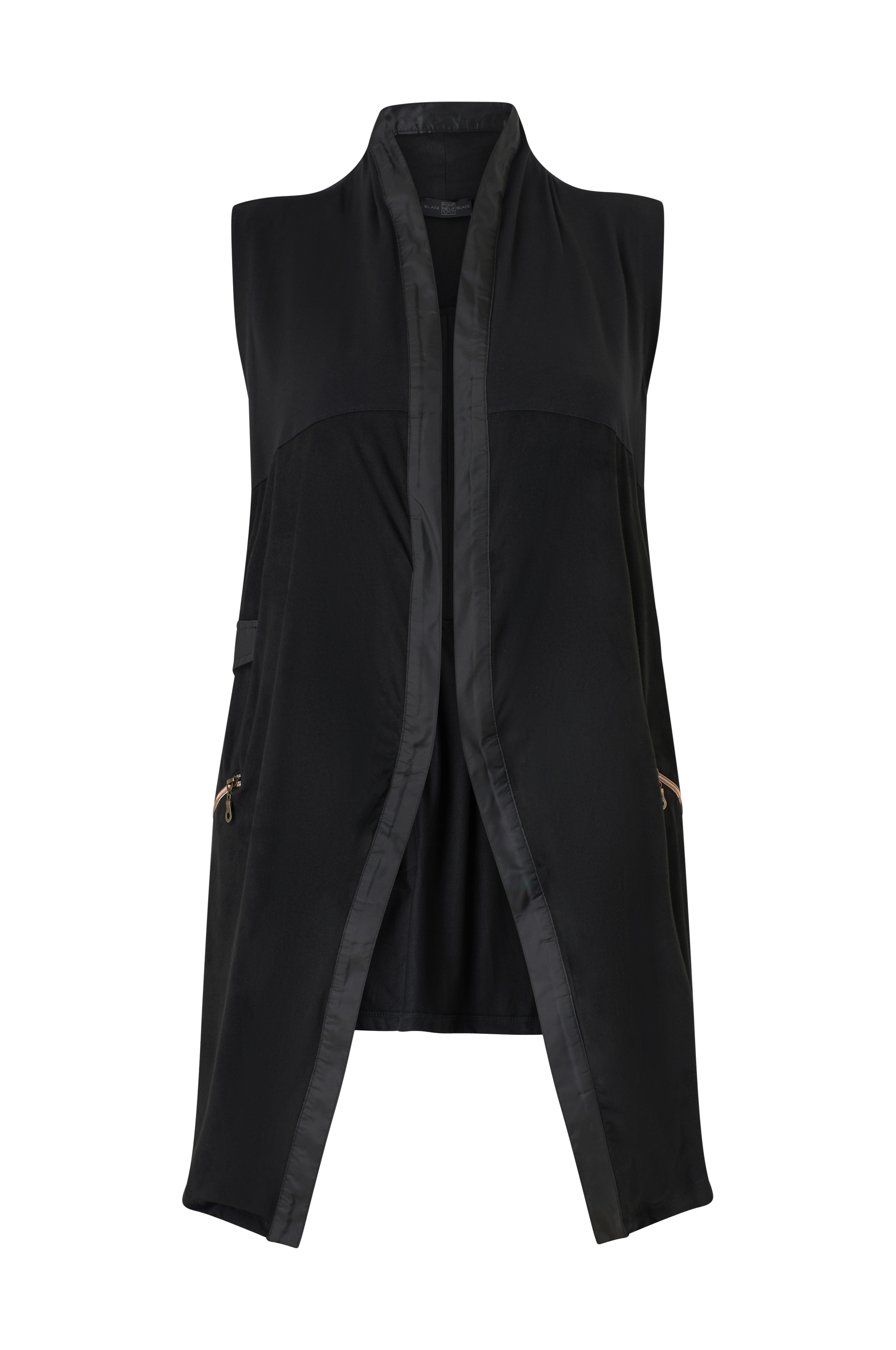 • Store størrelser• Lang model med vævet kant i halsen og ved fronten• Lommer med lynlås foran• Påsyet lomme bagpå• Tipskåret søm foran
