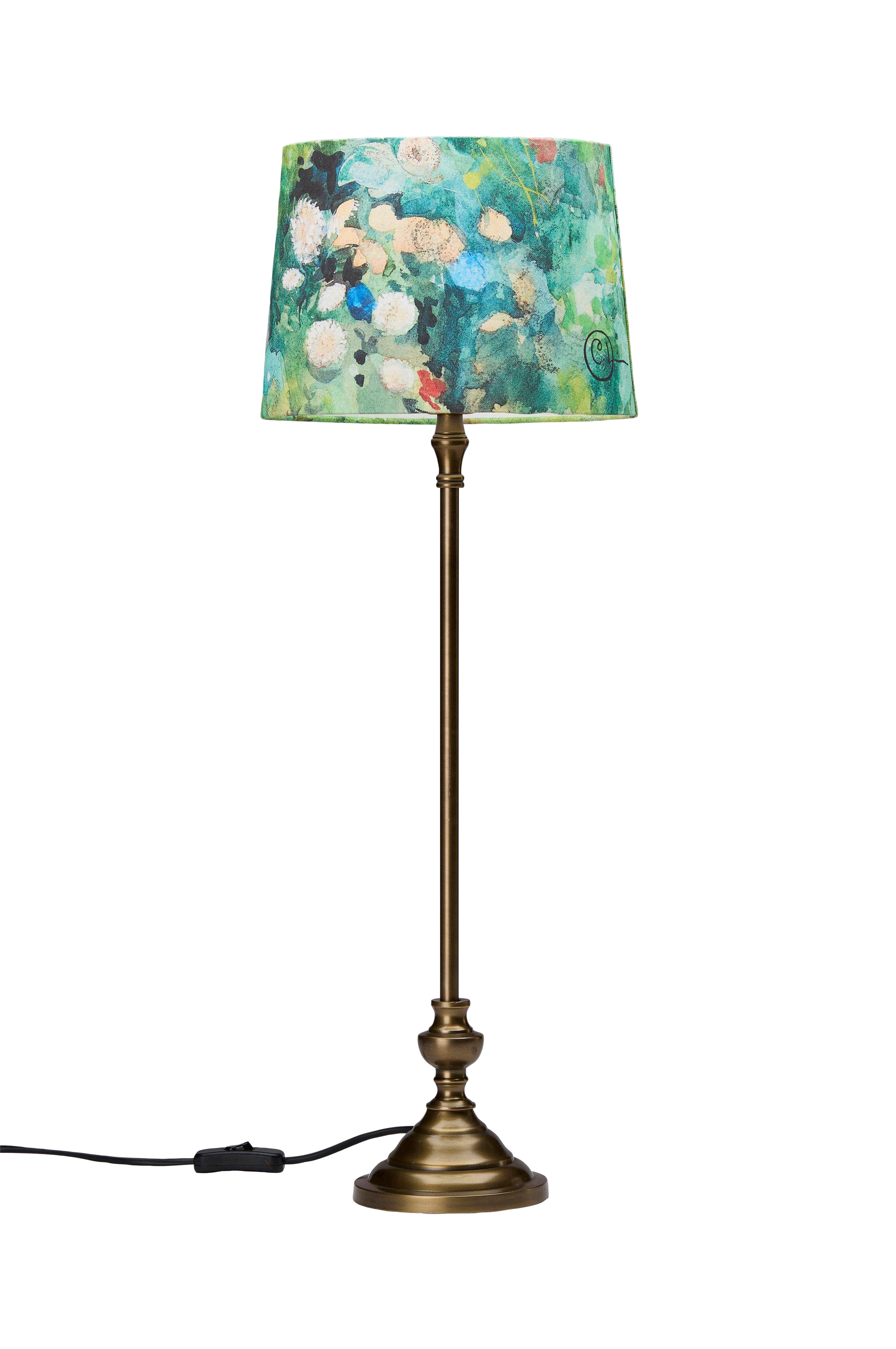Bordlampe Andrea, printet på skærmen stammer fra kunstneren Carl Larssons malerier. Skærmen har en lys inderside og rullede kanter. Formen er let A-formet og har en E27-holder. 1,5 m plastledning med strømafbryder ca. 30 cm fra pæren.
